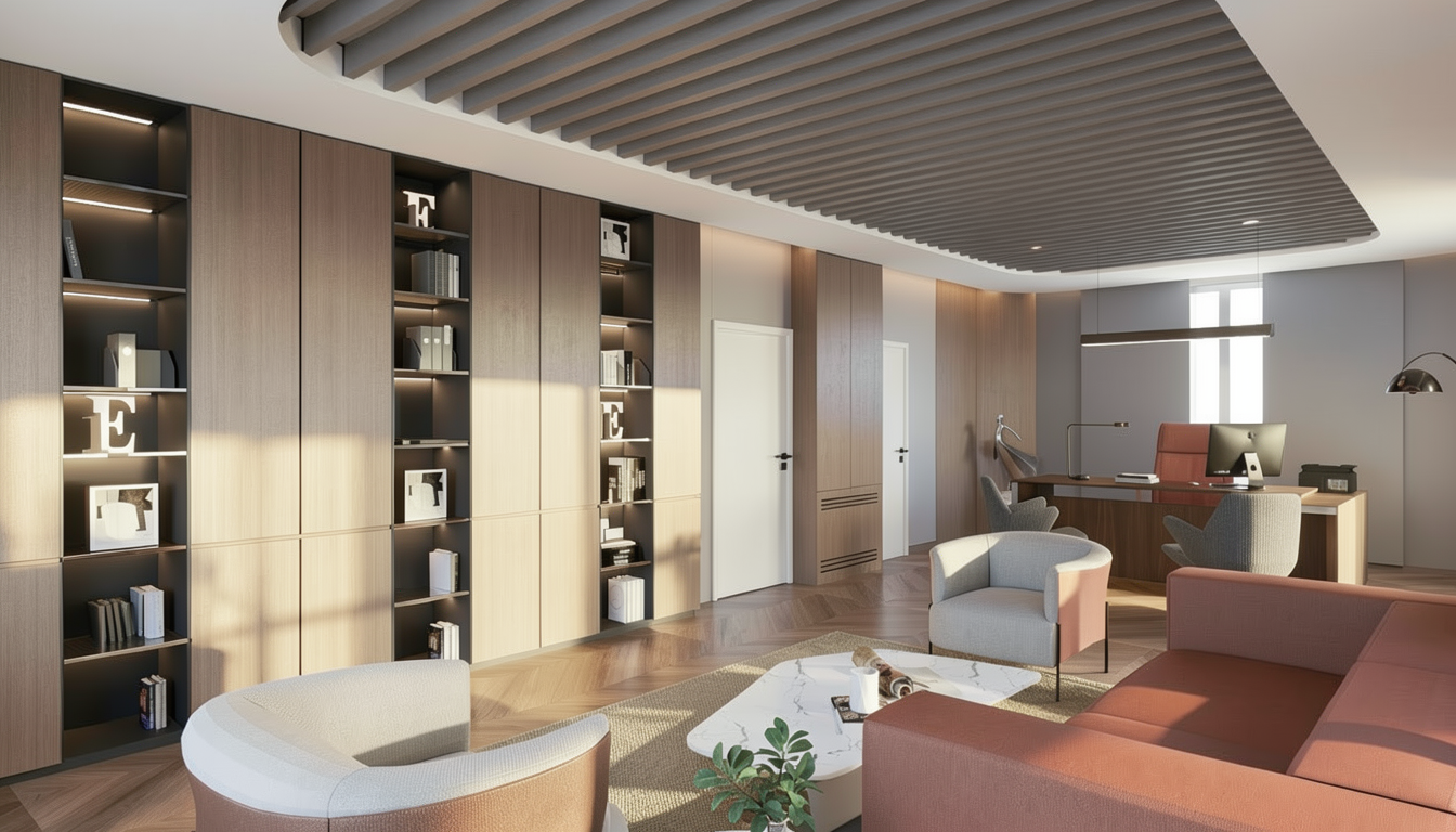 add an eight seater dining table to the right hand side of the image add reeded glass with no glare to the right rear unit add three only glass pendant lights above the kitchen island change nothing else within the image