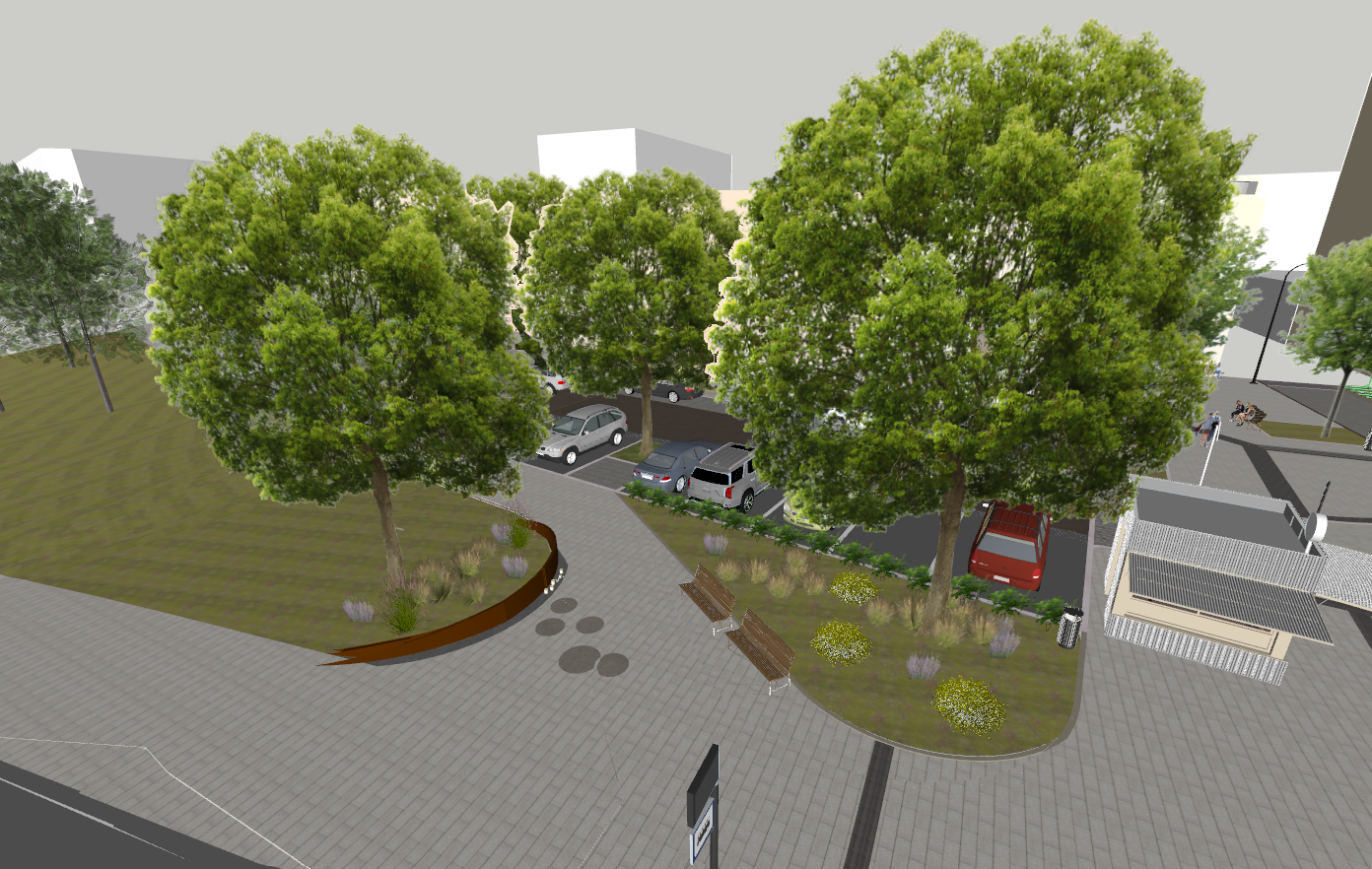 ultra realistic architectural visualization based strictly on the provided raw sketchup view preserve exact geometry proportions camera angle composition and architectural details do not redesign or alter the building enhance only with realism add realistic materials with physically accurate textures natural wood grain brushed concrete glass reflections subtle imperfections micro surface details use high dynamic range lighting with soft global illumination and realistic shadows create a lively atmosphere enhance environment with greenery slight wind in trees varied vegetation tones small urban details parked cars benches subtle signage add depth with atmospheric perspective and realistic sky conditions golden hour soft overcast choose whichever enhances the mood cinematic composition photorealistic rendering 8k detail realistic depth of field natural color grading slightly warm tones architectural photography style shot on full frame camera 35mm lens maintain realism over stylization avoid cartoonish or ai looking artifacts the round brown texture under the tree trunk is smooth round piece of corten