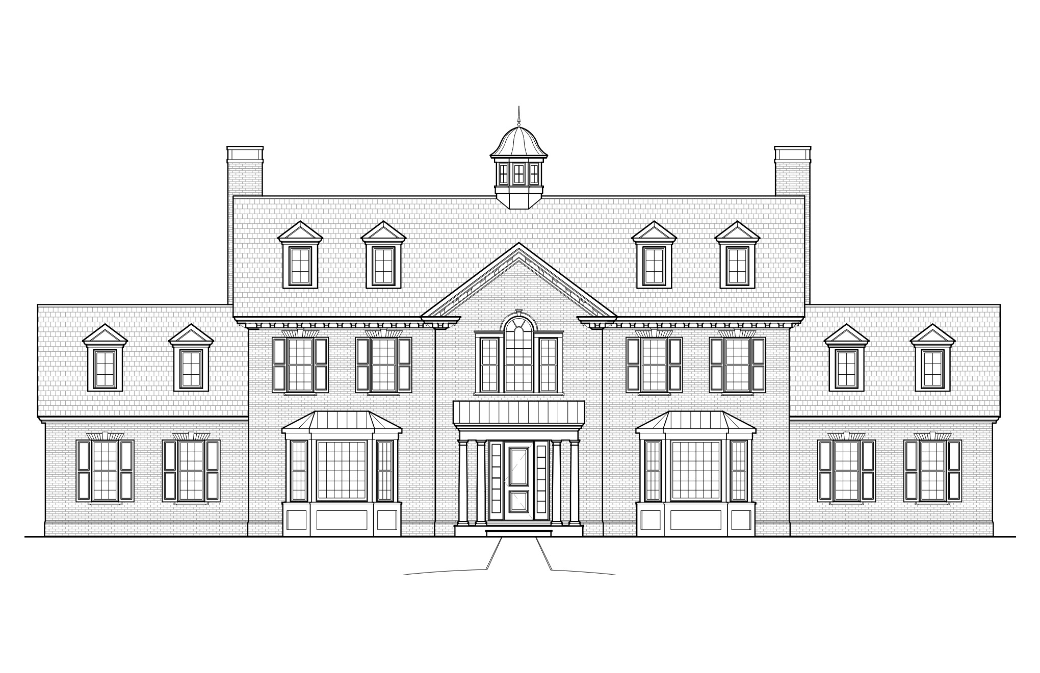 exterior shot exterior shot of georgian revival home with reclaimed brick white windows black shutters and dark roof with landscaping in front