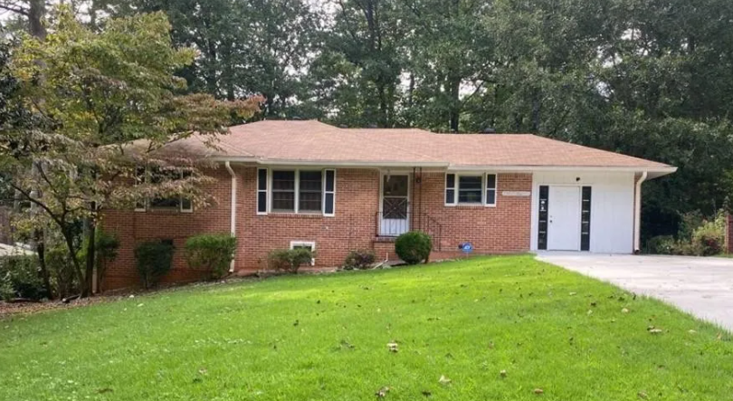 modern exterior shot create a render that keeps the current shape and style of the ranch style home walls to be a modern color palette with neutral tones roof to be dark gray asphalt shingle show southern usa native landscaping change the right side of the home into a garage keep the existing driveway and front yard architecture