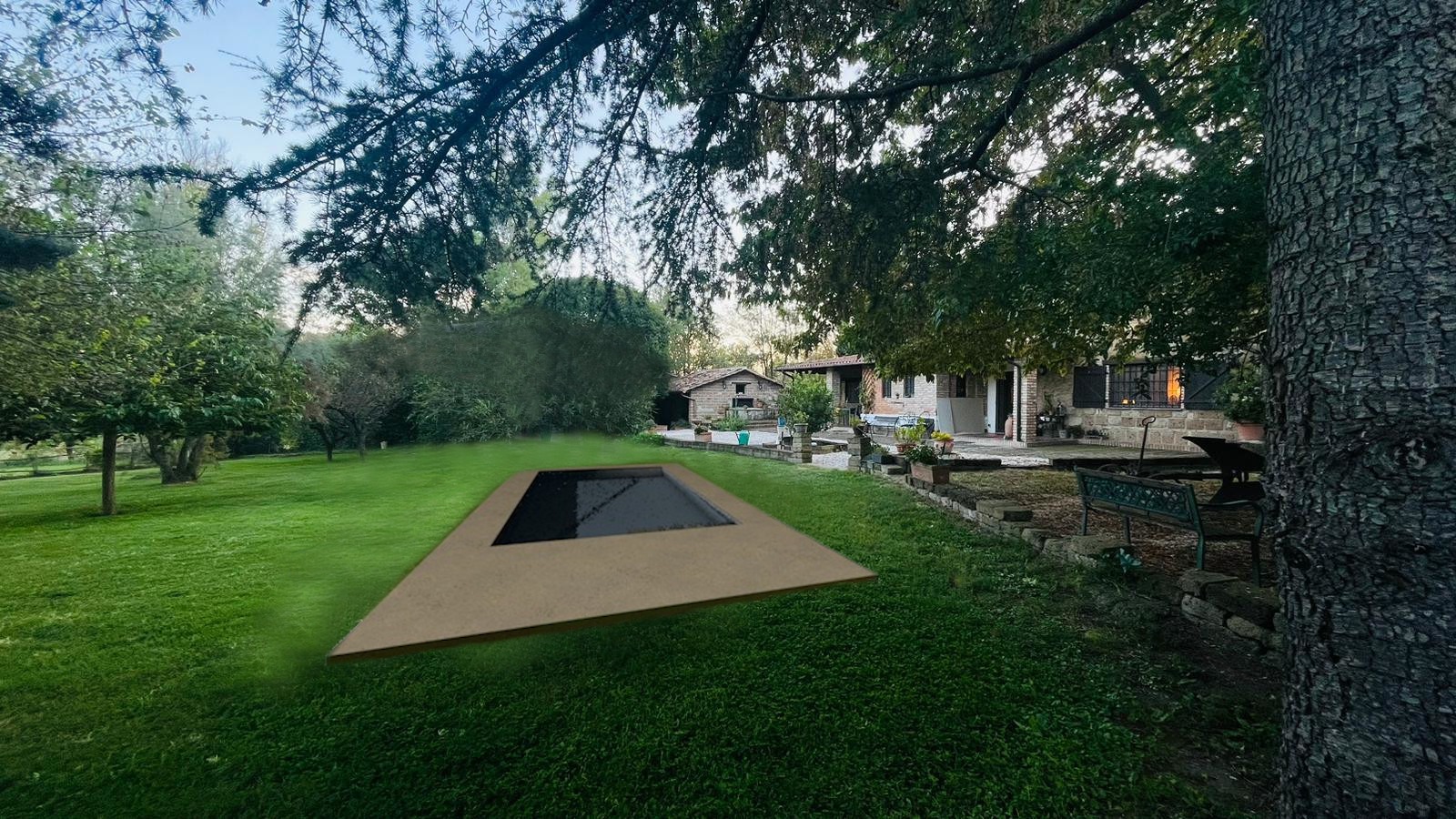 lot of light and reflects in the windows in the hills of la ciotat in south of france lauriers roses lavandes et oliviers lot of sun some meditterranean pine trees on the background in the center there is a pool sourrounded by natural stone and english grass