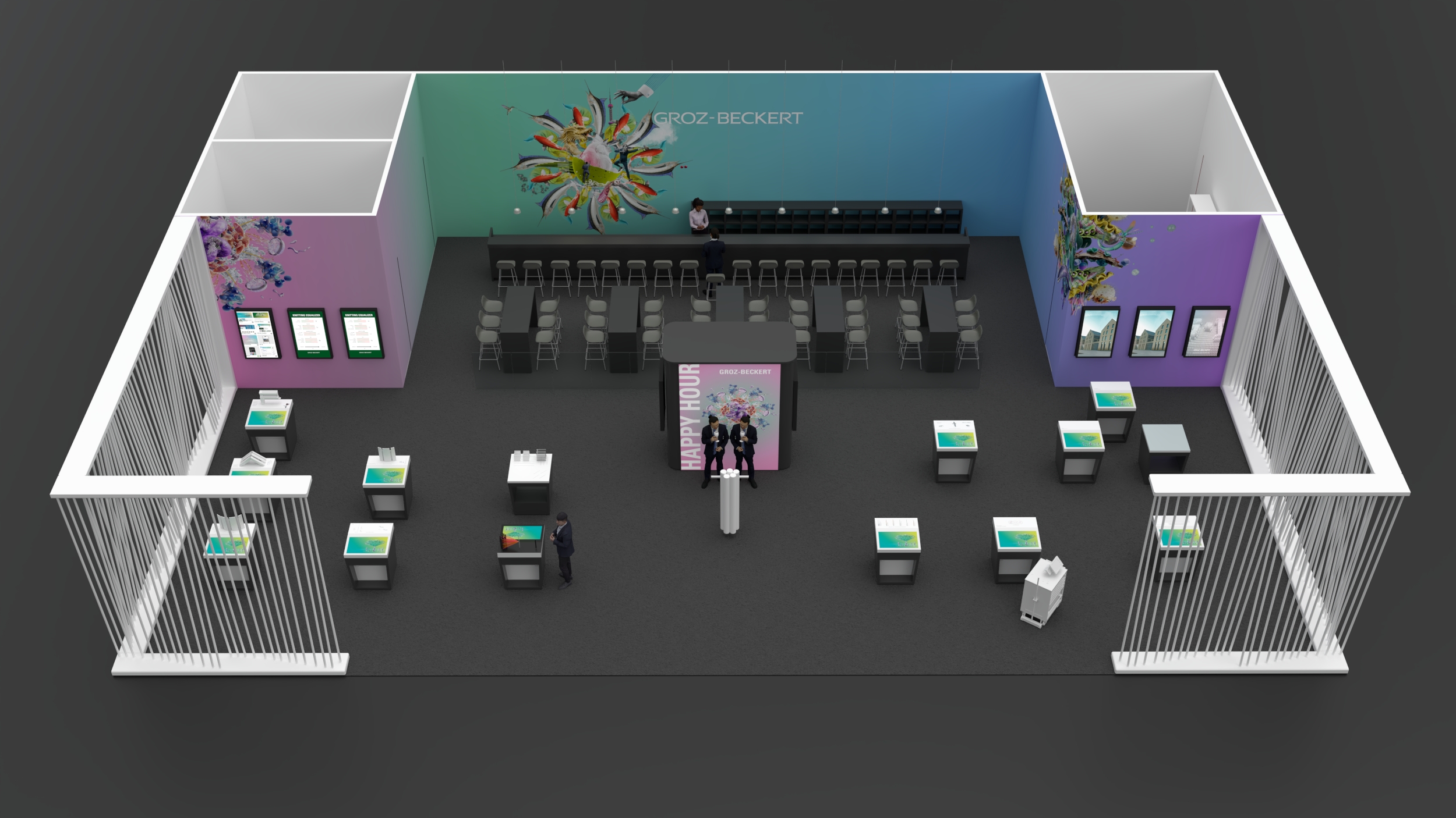 this is a corporate fairtrade booth shot from above add business people populate the catering area and the bar