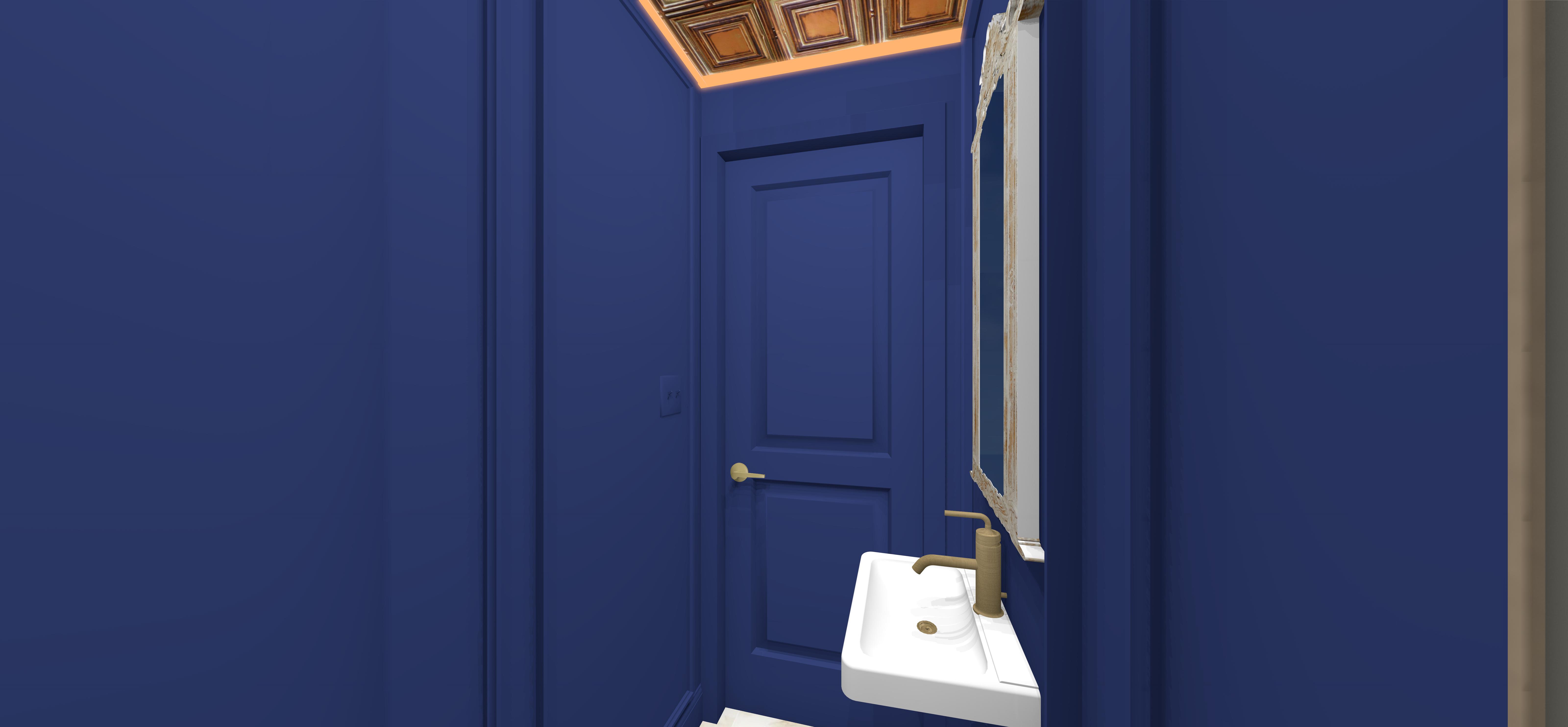 a small elegant bathroom with rich benjamin moore starry night blue walls and a matching door the ceiling features a wooden texture with warm overhead lighting creating a cozy atmosphere a white modern sink with a brushed brass faucet adds a touch of luxury a distressed wooden frame mirror adds vintage charm enhancing the space s sophisticated yet inviting feel