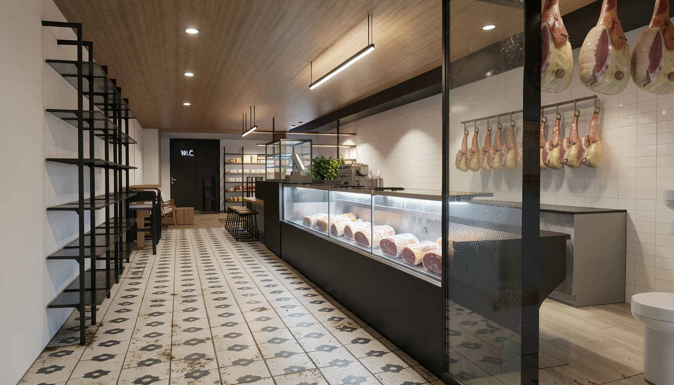 ultra photorealistic architectural interior render of a premium ham charcuterie and delicatessen shop 3ds max v ray corona style physically accurate materials pbr global illumination ray tracing high dynamic range 4k resolution important maintain the original layout and camera angle but extend spatial depth and improve proportions where specified scene adjustments increase the perceived depth of the space extend the background area naturally add more distance between foreground and back wall maintain perspective consistency adjust ceiling height make the ceiling feel slightly higher improve vertical proportions without changing composition floor clean refined keep the same patterned tile design remove all dirt stains and wear add subtle gloss and soft reflections maintain visible tile joints but cleaner and more uniform slight micro variation in reflectivity for realism not dirty refrigerated display important change replace all whole ham pieces with thinly sliced prosciutto in vacuum sealed packaging packs of prosciutto shavings virutas neatly arranged add realistic plastic reflections slight condensation and packaging imperfections maintain clean and organized presentation walls left side walls change from white to matte black finish subtle texture and light absorption for realism shelving products left entrance shelves add a variety of delicatessen products for sale wine bottles olive oils preserves gourmet snacks natural slightly imperfect arrangement not repetitive background shelving area fully stocked mini market style shelves dense product layout with realistic variation remove remove the w c sign completely from the back door bar element upper shelves on the suspended wooden shelves above the counter add alcohol bottles wine spirits etc natural bar style arrangement realistic glass reflections and label variation hanging ham realism fix replace existing ham legs with highly realistic iberian ham accurate color variation fat cured meat tones natural imperfections and asymmetry realistic surface texture not plastic looking materials upgrade improve all materials with micro imperfections fingerprints slight wear correct roughness and reflectivity maps high quality textures no repetition lighting maintain existing lighting layout improve realism with balanced exposure soft shadows and ambient occlusion natural light falloff cooler lighting inside fridge warm interior lighting balance camera post keep original camera position and framing add slight depth of field subtle lens distortion minimal chromatic aberration filmic tone mapping keywords ultra photorealistic archviz 3ds max render v ray corona renderer global illumination ray tracing pbr materials realistic lighting soft shadows high detail 4k interior visualization