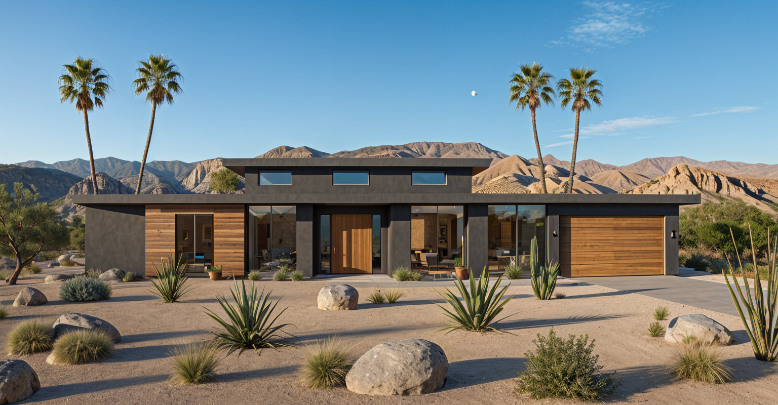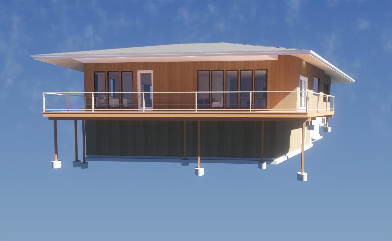 exterior shot vertical cedar tongue and groove siding asphalt composition shake roofing black framed windows and doors trex decking on deck cable rail on the deck railing set the house as being on a sloped lot with trees around the home add landscaping around the home in the form of barkdust and shrubs no grass
