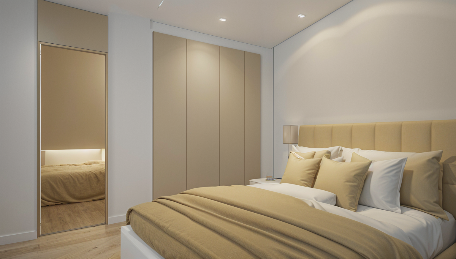modernist interior shot interior shot render a modern kitchen in a minimalist style featuring sleek white cabinetry with gola black handles incorporate a dark wood paneling for the backsplash and window frame to add warmth the countertops exude elegance with a deep charcoal gray finish design the oven to exhibit stainless steel details with a soft blue light use wide plank oak flooring to enhance the warm atmosphere the walls are a gentle dove gray giving a serene and sophisticated ambiance soft diffused lighting creates a cozy and inviting environment mountains view architecture