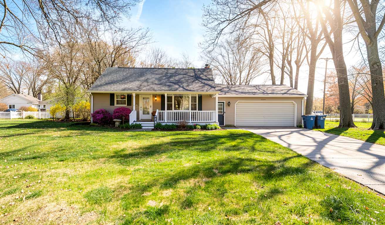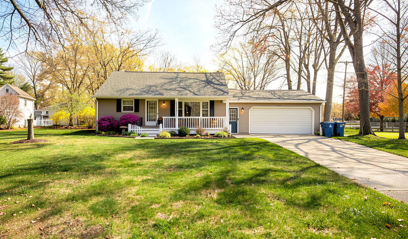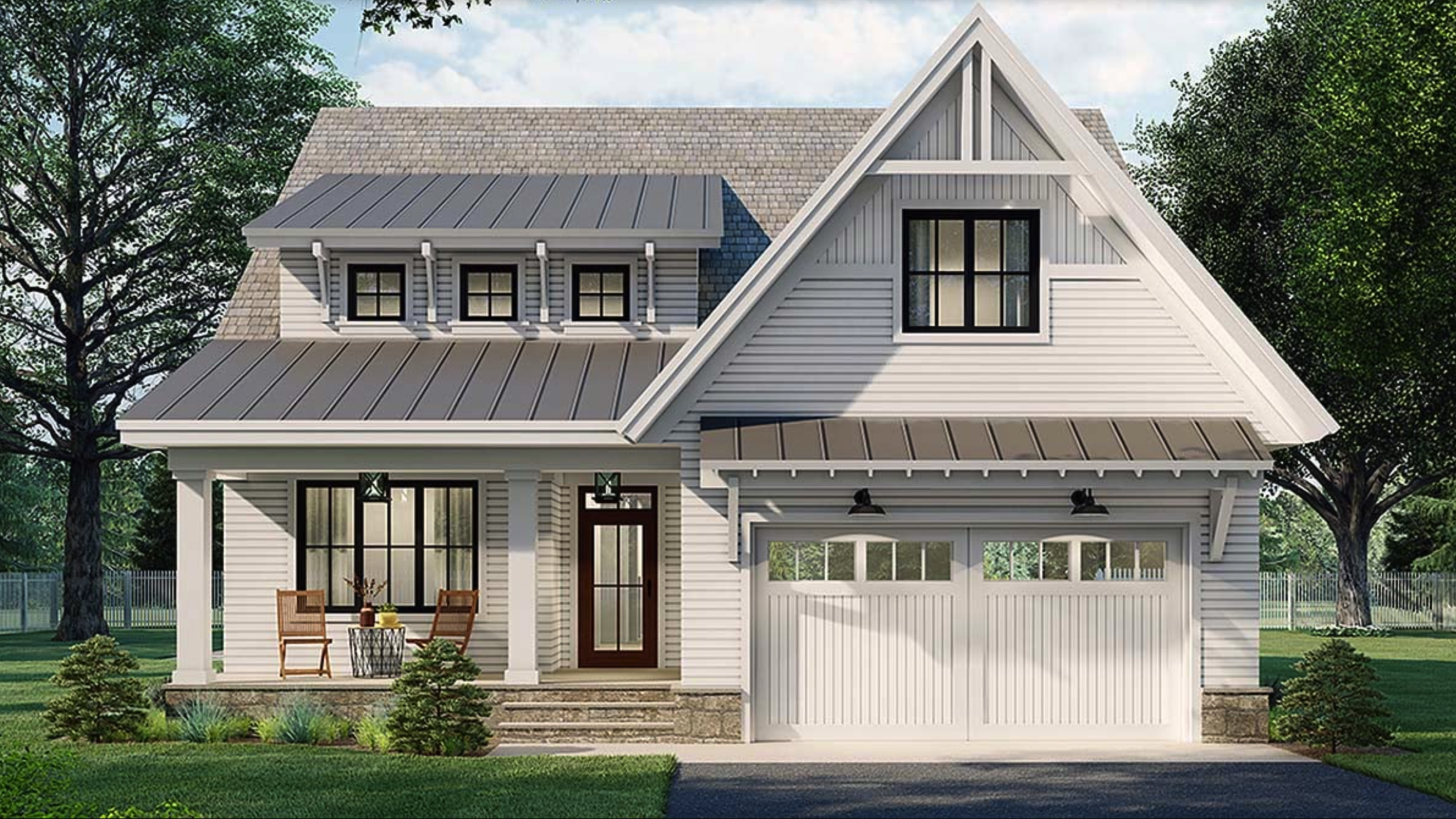 please make this home have black cedar shakes at the gable front keep the same window plan but change the color of the siding to slate color the metal part of the roof should be black standing seam the asphalt shingles should be black and garage doors should be black to match window trim replace the front door with a natural craftsman wood style prepare this rendering so it looks like a real home and not ai generated the siding should be slate gray cedar shakes all trim around windows doors and garage doors should be black