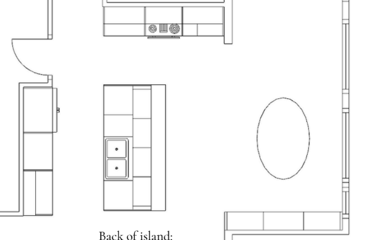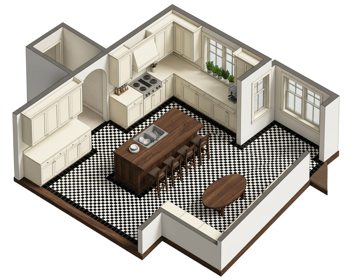 convert this floor plan into a realistic isometric 3d view of a kitchen show the space from an elevated angle with furniture walls and details visible white and black 1x1 floor tiles with a border off white kitchen cabinets with a dark walnut kitchen island with seating for 4 use the same furniture as shows on the plan do not change the orientation of the floorplan