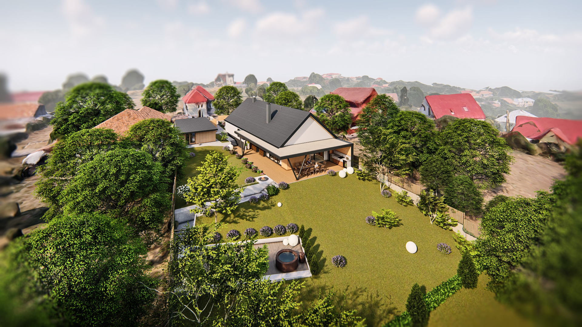 important preserve the existing geometry and the existing context exactly as provided do not modify alter reinterpret add remove scale or reshape any geometry do not change the site surroundings street layout neighboring buildings vegetation or context elements do not modify geometry scale proportions buildings road layout sidewalks or surrounding context in any way do not change text photorealistic architectural rendering clean and balanced contrast calm cinematic mood style contemporary european residential architecture minimalist premium understated soft overcast noon atmosphere diffused natural daylight with subtle blue grey tones cinematic architectural mood large glass surfaces with realistic reflections soft mirror effect subtle environmental reflections of sky and surroundings warm interior light 4000k realistic global illumination soft shadows calm and minimalist nordic mood photorealistic architectural visualization balanced exposure no harsh highlights interior flooded with warm light do not change the wood surface and texture do not modify text do not modiffy people faces