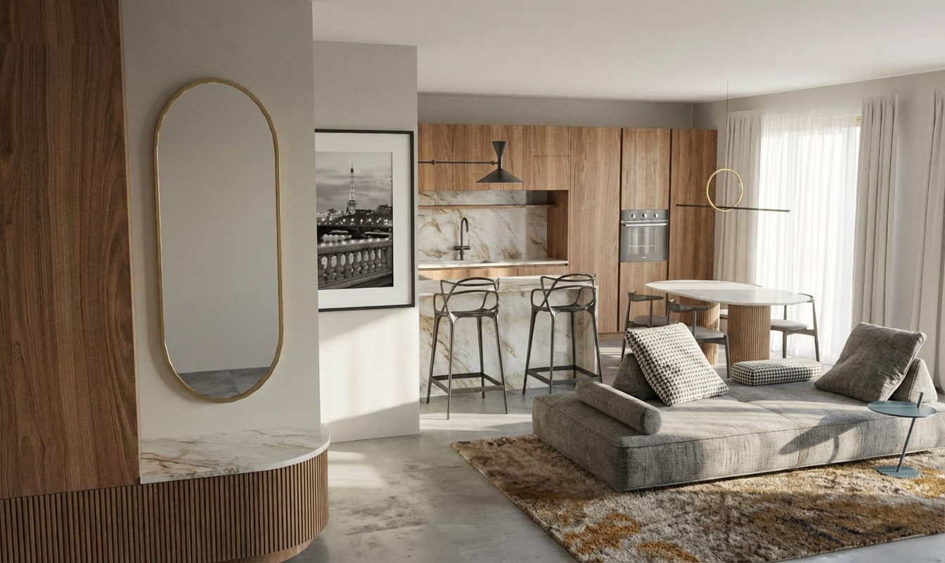 transform this furnished 2d floor plan into a realistic 3d interior perspective maintain the exact layout and scale of the furniture shown sofas tables beds use a wide angle camera at eye level 1 6m style modern minimalist with realistic materials like polished concrete floors and textured plaster walls add soft natural light from the windows to create realistic shadows on the existing furniture