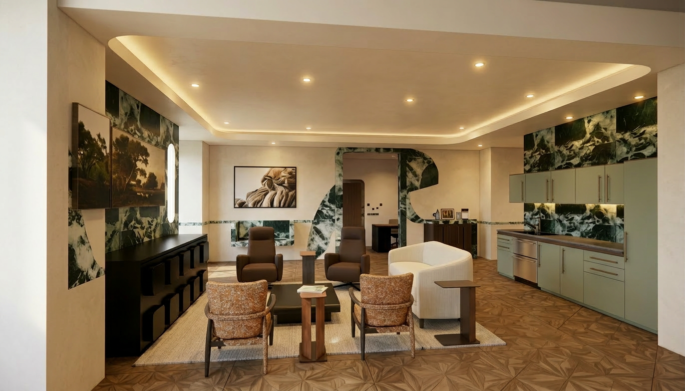 convert this floor plan into a realistic isometric 3d view of a living room show the space from an elevated angle with furniture walls and details visible a axonometric view of a axonometric diagram of the apartment with the ceiling removed to show the full layout maintain the kitchenette seating area and window wall use smoked oak leaf patterned flooring light limestone plaster walls green marble accent panels muted green cabinetry with metal handles and walnut millwork include simplified furniture and people in a clean architectural illustration style use the same furniture as shows on the plan do not change the orientation of the floorplan
