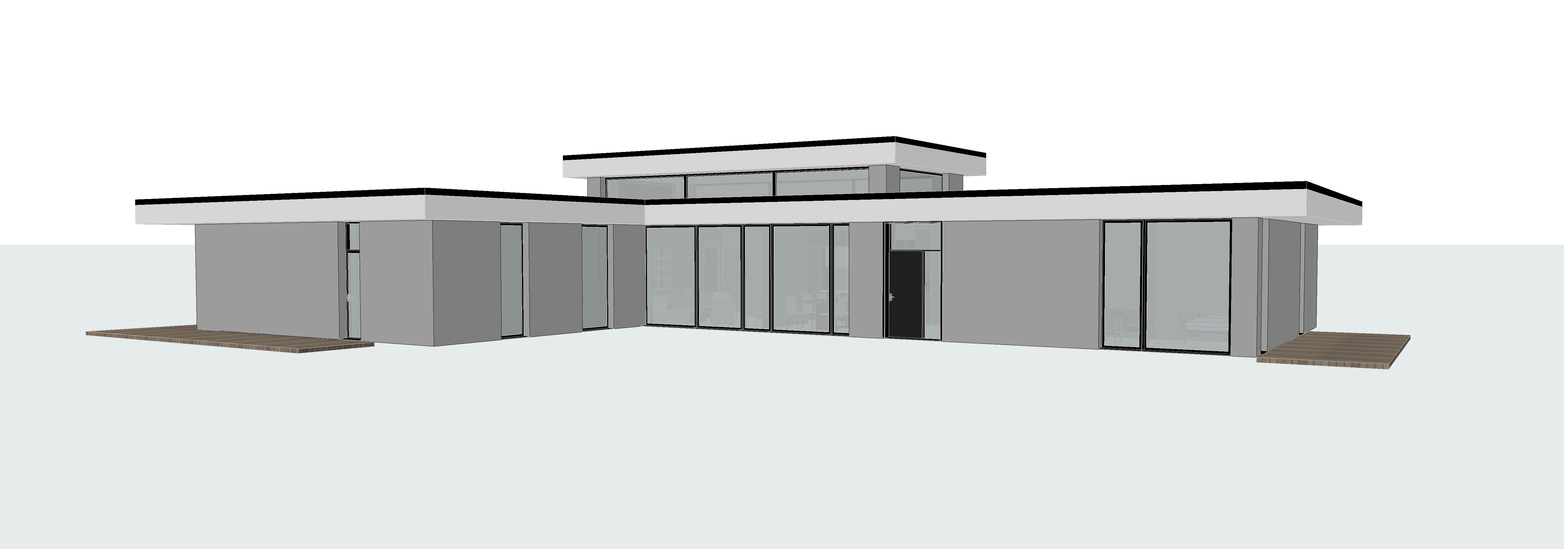 create a photorealistic image of a modern single story house with contemporary minimalist architecture and a flat roof the building has large floor to ceiling windows and partially uses beige colored wooden cladding on the facade combined with modern materials like glass and concrete the house includes a slightly elevated central section where narrow low horizontal windows run continuously around the building in front of the house there is a spacious terrace that connects to a well maintained green lawn with flowers and simple landscaping the entrance is fully accessible for wheelchair users with a gently sloped ramp integrated naturally into the design the architectural style should resemble modern yacht club architecture light elegant and coastal add exterior cornices and detailing typical for seaside buildings that provide shade and protection from weather bright natural daylight realistic materials high detail architectural visualization photorealistic rendering add some romantic cnc elements to the house make entranca fancy dont change windows