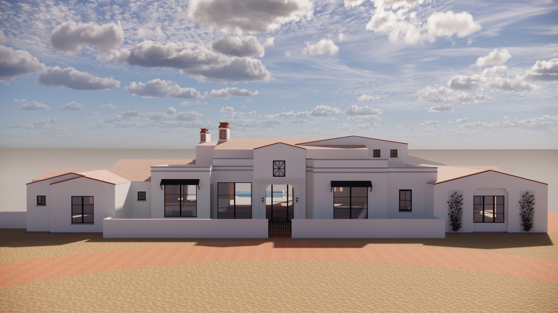 photo quality spanish style home in phoenix arizona the blue skies are clear at midday and there is a lot of accent lighting in the front sandy areas add some desert plants show some furniture inside the house