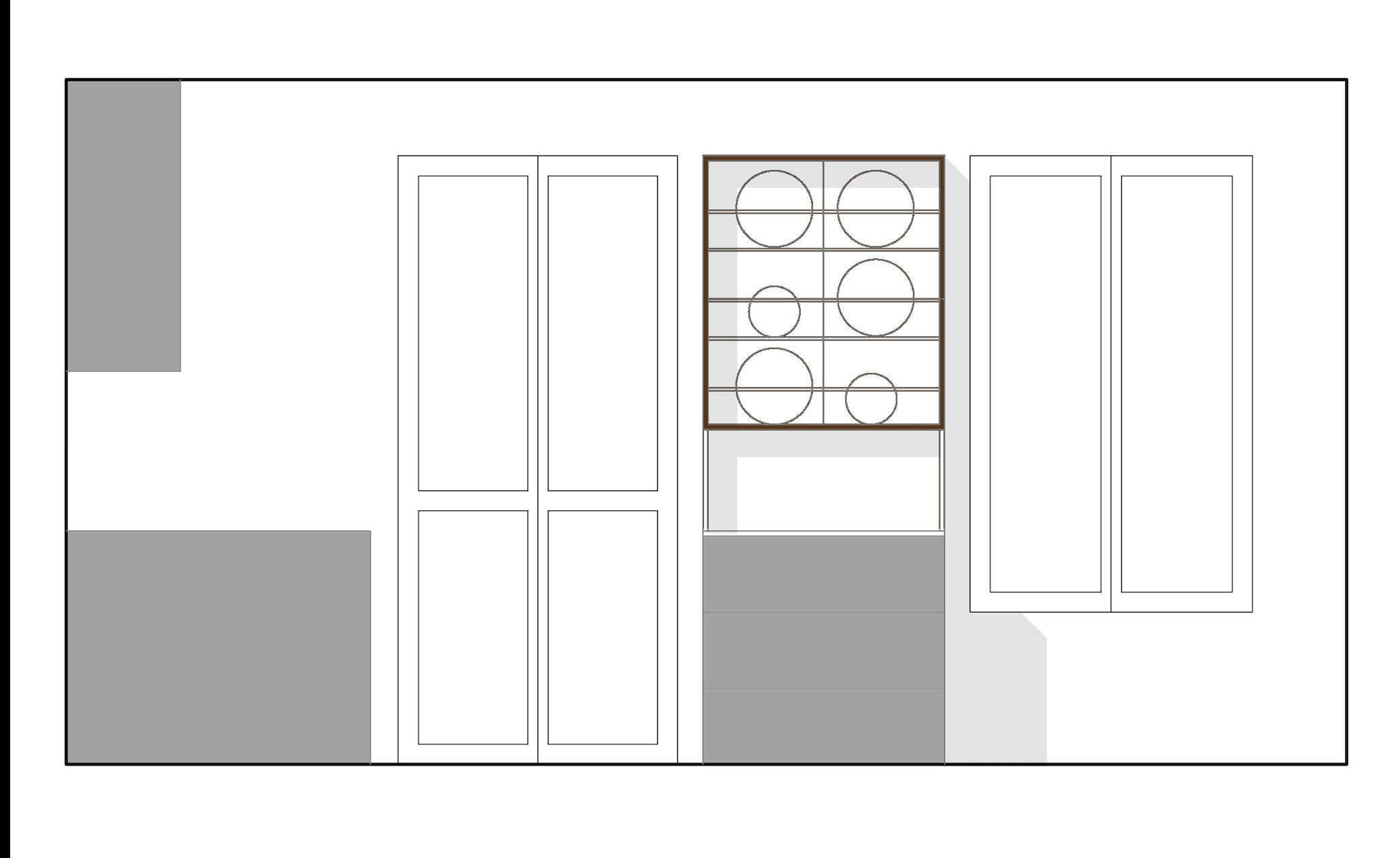 exterior shot place the grey cabinet with drawers at the bottom and shelves for displaying plates at the top between the two windows the top part is made of dark wood