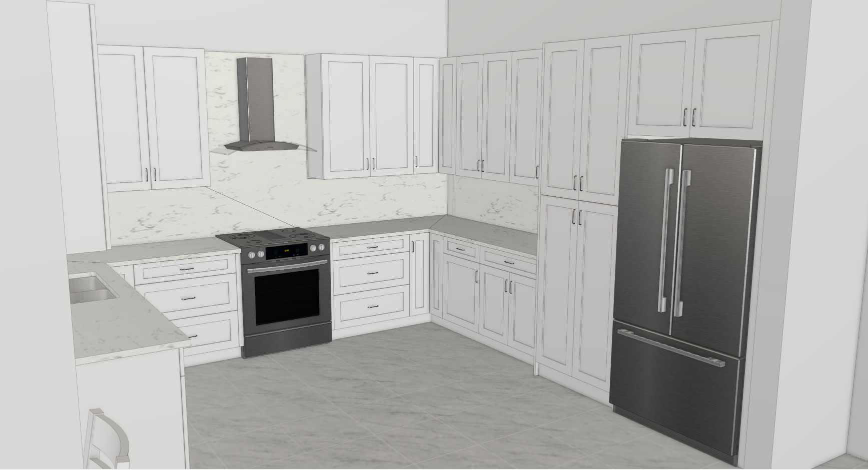 create a high end photorealistic render of the provided kitchen design important do not modify the layout do not add remove resize or relocate any cabinets appliances walls panels or structural elements maintain the exact cabinet configuration and proportions as shown in the original design only enhance materials lighting ceiling height and realism ceiling height very important the kitchen cabinetry height reaches 8 feet the actual ceiling height is 11 feet you must extend the ceiling vertically to reflect a true 11 foot height maintain correct architectural proportions do not stretch cabinets only increase wall height above cabinetry add a clean modern flat ceiling integrate recessed led downlights optionally add subtle crown transition above cabinets if architecturally natural minimal and clean lighting warm neutral 3000k 3500k soft ambient distribution no harsh shadows cabinet doors critical standard american shaker style flat recessed center panel 90 degree interior edges no decorative profile no bevel not raised panel not slim shaker finish white semi gloss lacquer soft reflective sheen smooth sprayed surface neutral white tone maintain realistic shadow depth inside recessed panel countertop backsplash upgrade realism material white marble with subtle natural gray veining polished finish with higher gloss level elegant and refined surface important remove all visible seam lines or joint lines from the countertop surface must appear as a continuous slab no visible fabrication joints enhance realism with stronger natural reflections subtle surface depth soft specular highlights micro texture variation realistic edge thickness backsplash must appear continuous and seamless as well flooring medium format white porcelain tile elegant black veining marble look tile satin finish thin grout lines clean modern luxury aesthetic appliances brushed stainless steel accurate reflections real metallic depth subtle imperfections realistic oven glass transparency do not change placement or size details subtle caulking where cabinets meet walls clean reveal lines realistic cabinet thickness accurate shadow transitions decor minimal and elegant small plant fruit bowl subtle kitchen accessories no clutter camera style architectural photography style eye level perspective wide angle without distortion high dynamic range ultra realistic render quality