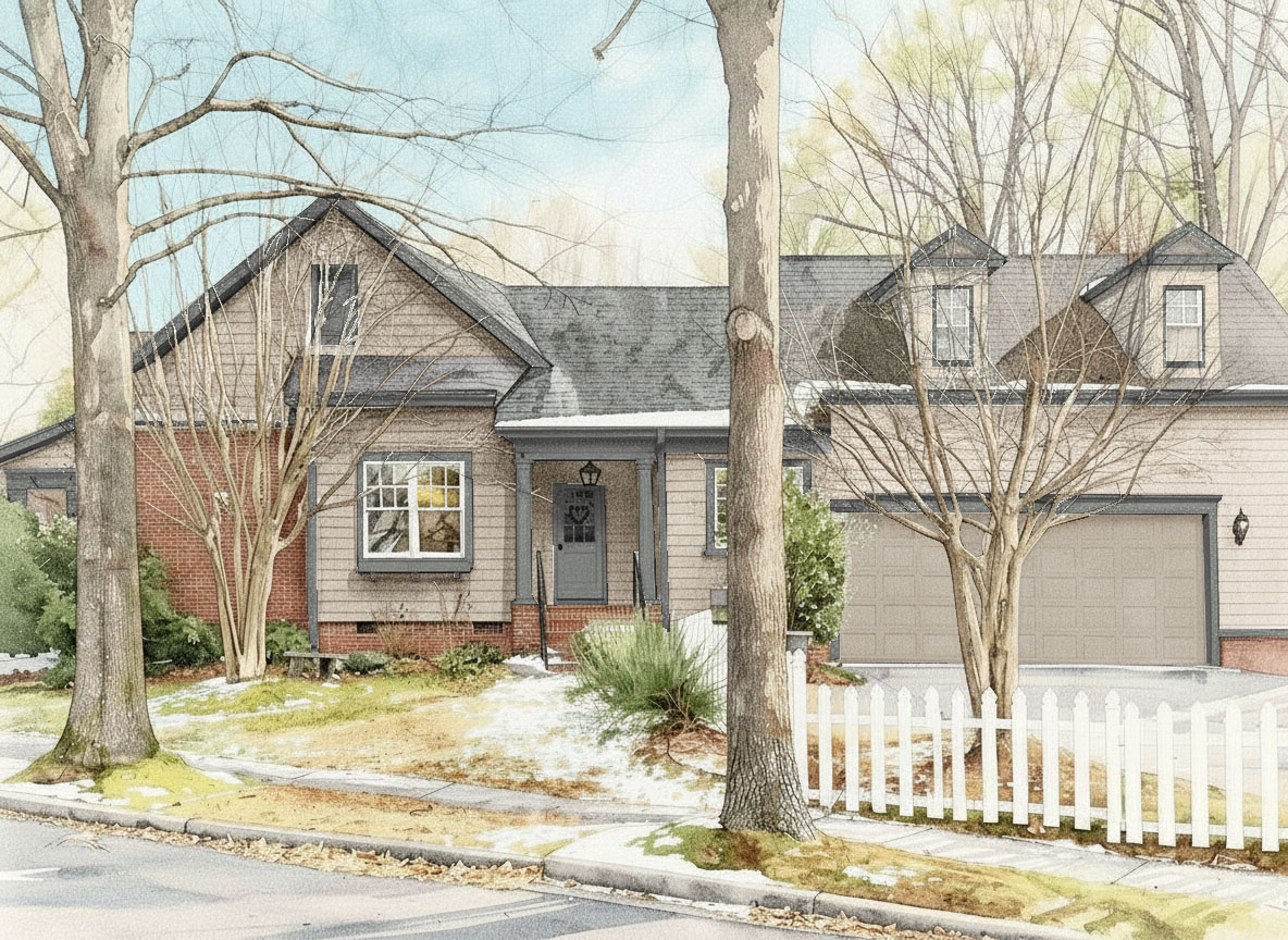 recreate this rendering to look photoreal also remove the snow on the roof the garage door color should match the siding of the house