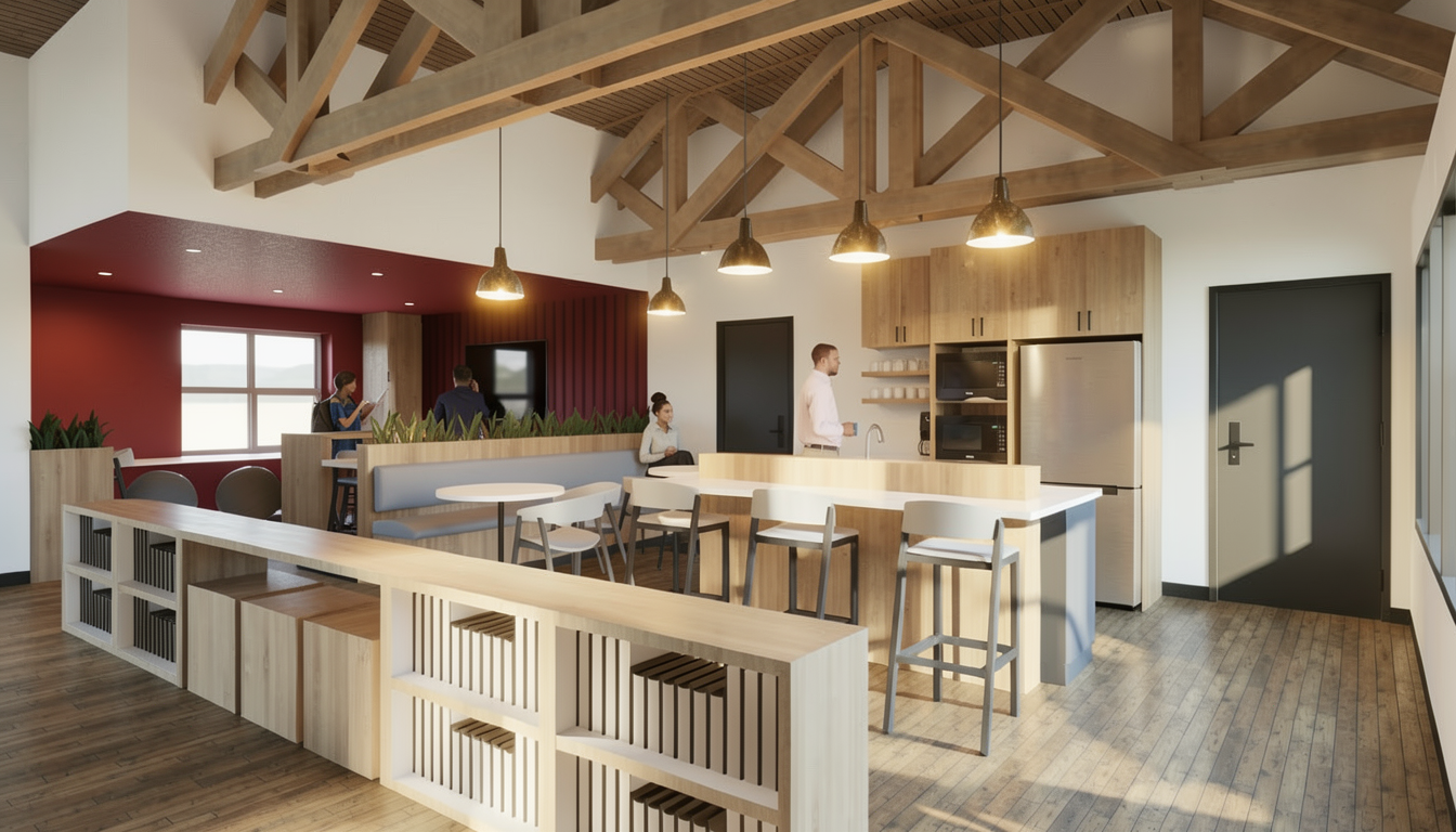 photorealistic architectural render add natural light coming from the left side of the image turn on light fixtures with soft white light keep the original colors and tones