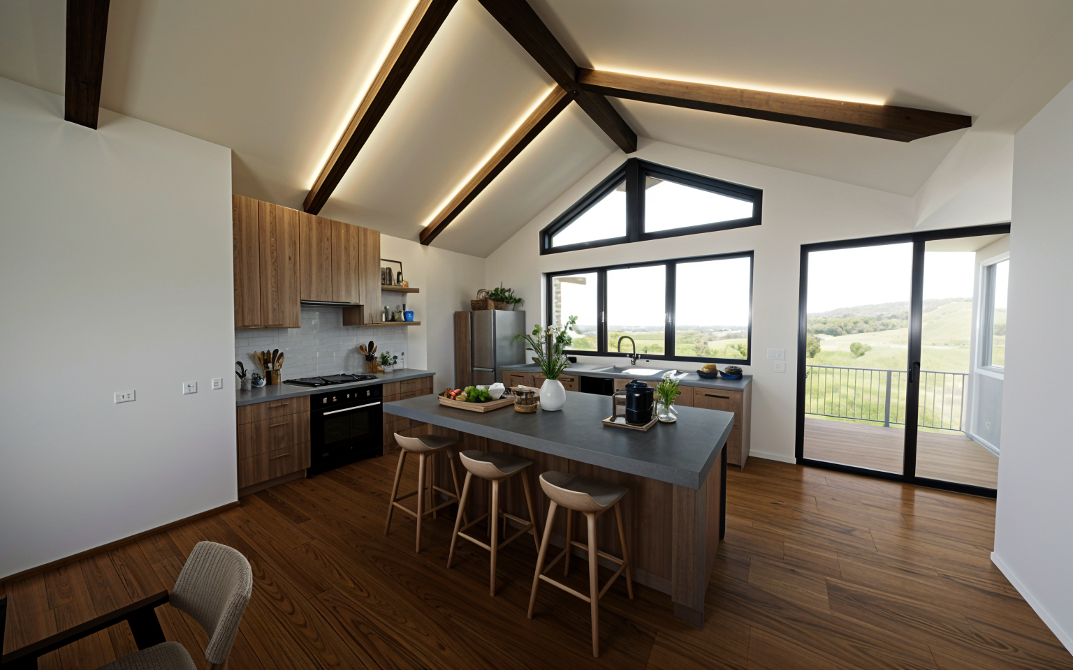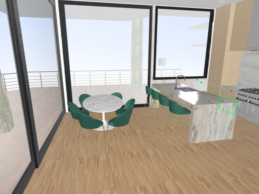 modern kitchen and dining area with large windows showcasing a bright and airy atmosphere the color palette includes light wood flooring soft beige and white cabinetry and a marble countertop with subtle gray veins the dining chairs are a deep teal color providing a striking contrast the bar stools are teal with gold legs adding a touch of elegance natural light is flooding the space creating a warm and inviting ambiance the overall feel is minimalistic stylish and contemporary architecture