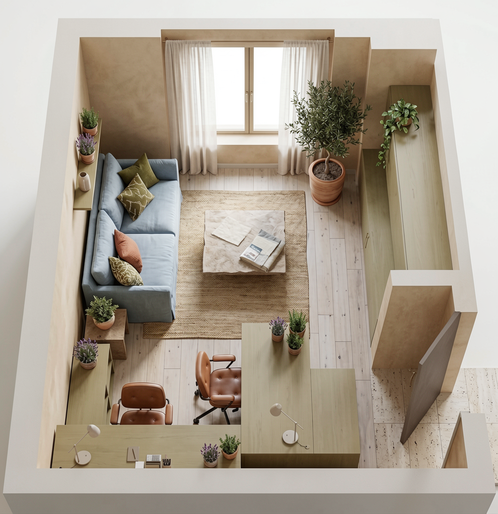 photorealistic render of a business lobby space add a black man standing at the transaction window and an asian woman sitting in one of the side chairs add a receptionist at the reception desk enhance the lighting to feel bright and welcoming without being overwhelming change the couch fabric to a soft light blue and the side chairs to a lightly textured light gray with wooden legs do not touch the flooring change reception desk to a gray solid surface material similar to the door frames the glass in the middle of the image is a transaction window change it to look more like that and reduce the reflections