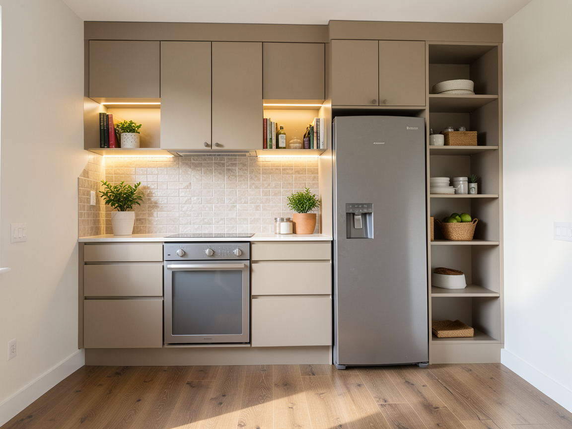 render an interior elevation of the exact midcentury modern kitchen in the interior elevation drawing on a sunny day with warm white walls walnut wood cabinets that go to the ceiling of the standard height room white industrial appliances with brass hardware a painted plaster simple square vent hood simple brass cabinet hardware a terracotta and cream checkered tile backsplash that goes from the countertop to the base of the cabinets only and has a white stone shelf between the cabinets under the vent hood at the top edge of the tile right of the refrigerator is a darker walnut wood door the built in bench on the right is made of wood to match the cabinets and has vertical tufted cushions in a terracotta colored linen fabric the bench has a brass rail on top there is a wood floating shelf on the wall above the bench at the same height as the stone shelf there is a cabinet of drawers facing the refrigerator behind the bench do not zoom back far enough to see walls beyond the cabinets in the image