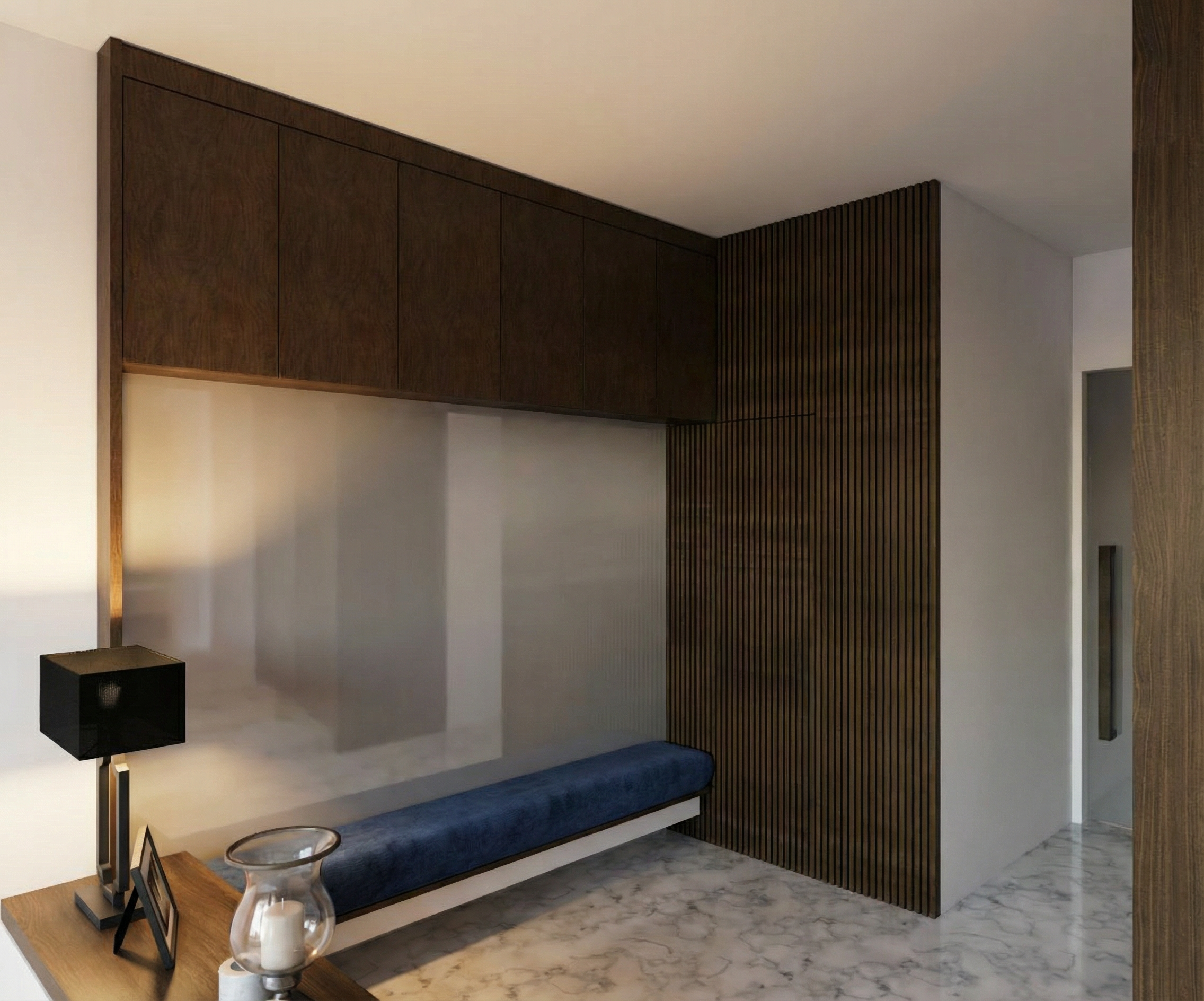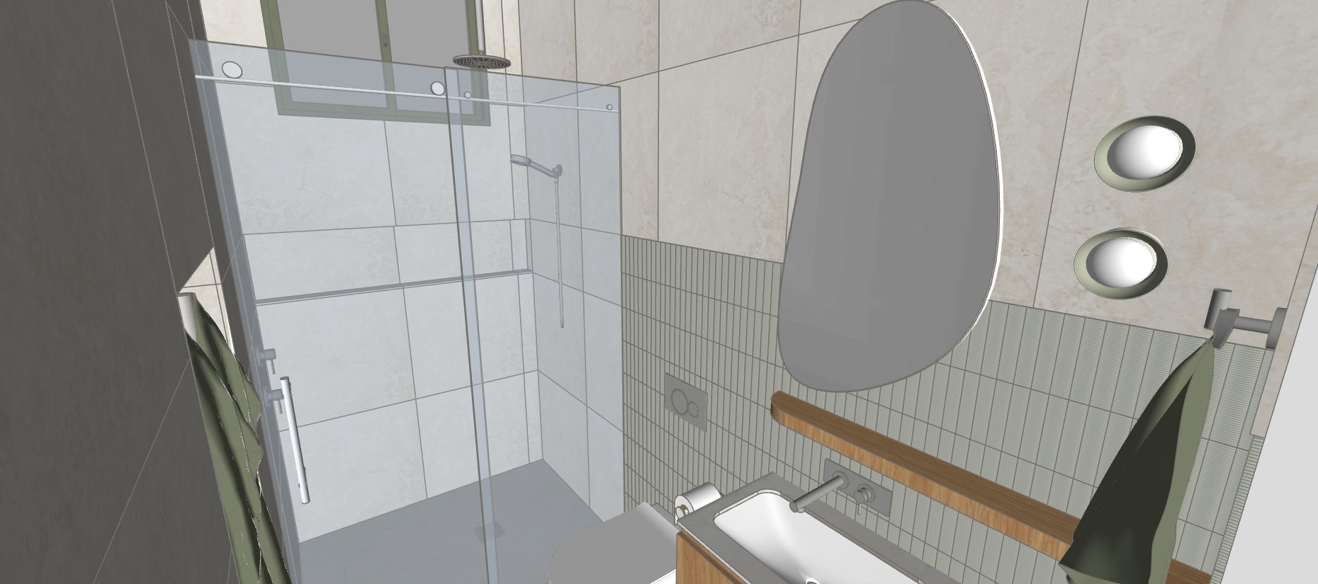 render this bathroom exactly like the image on the floor and walls is a 600x1200mm creamy beige tile with subtle veining behind the vanity is a mosaic finger tile with greens and whites veining through it run this tile from the floor to half way up the wall with the wall mounted tapware poking through make it one row less of the mosaic tile than the image for the height the section of wall with the mosaic tile goes from the right side of the vanity to the left of the toilet and stops at the shower screen it is at the same height add a timber shelf the width of the vanity with curved ends at 100mm deep as per the image add warm light from the sconces green towels are hanging on the towel rails and the towel hook