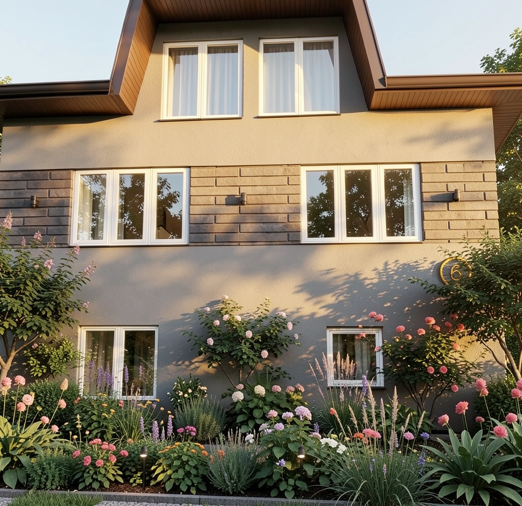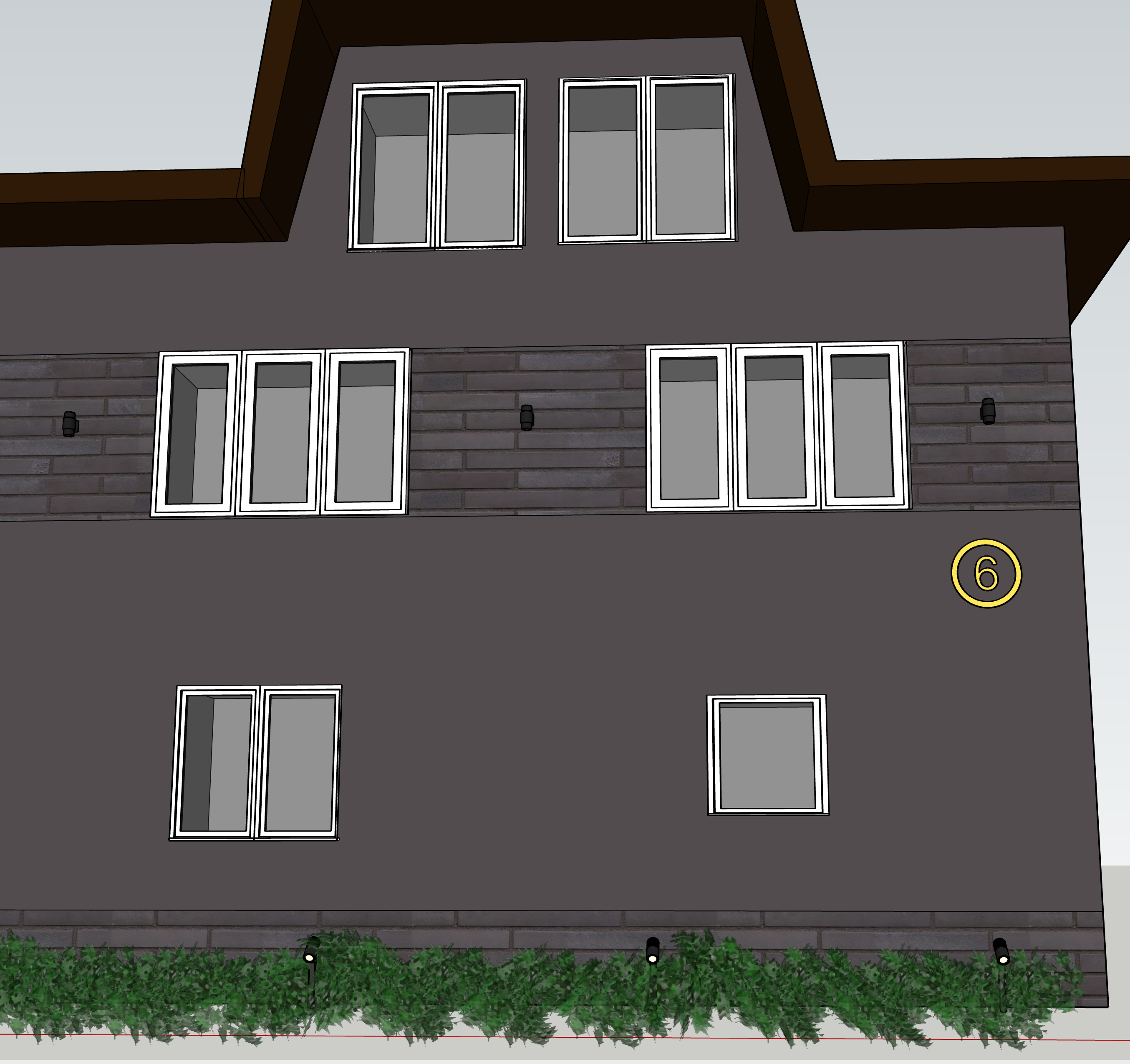 add garden in front off the house make it evening light make the house dark gray make number 6 glow make lights glow don t add the door follow the original image