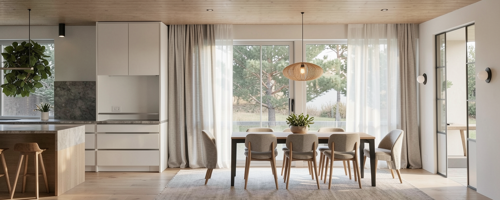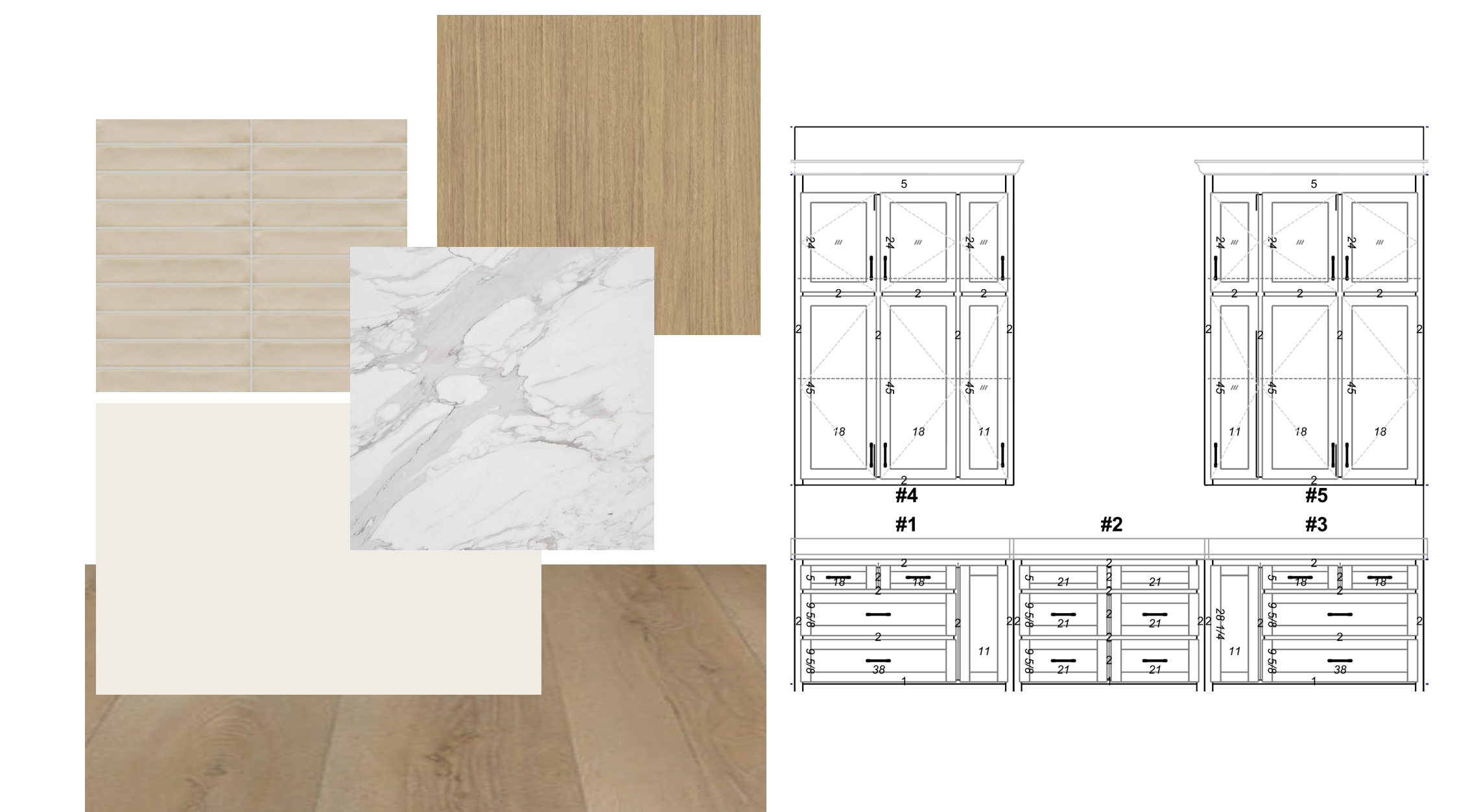 modern kitchen with shaker style cabinets white cabinets on the base and oak cabinets finish on the upper cabinets marble countertop with light gray veining backsplash is a cream long rectangle tile wood flooring in medium oak finish
