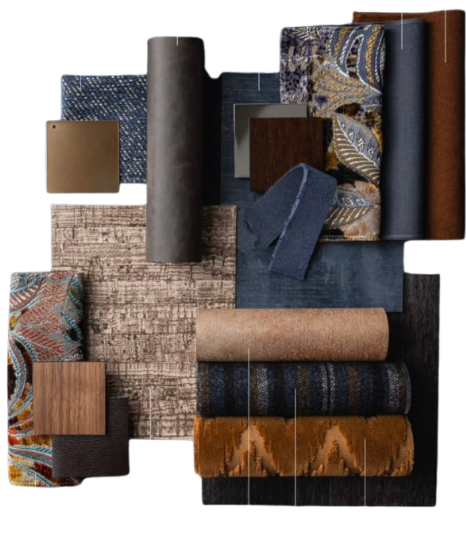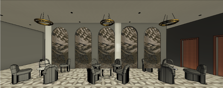 exterior shot prompt create a high quality hyperrealistic 3d rendering of a sophisticated lounge space based on the provided model keep the existing layout furniture placement and flooring pattern unchanged design style upscale moody art deco inspired lounge with rich textures and a warm intimate atmosphere ceiling design important add a lowered circular oval ceiling feature centered above each chandelier finish smooth matte plaster in warm off white integrate hidden led cove lighting around the inner edge for a soft glow chandeliers should hang slightly below this dropped ceiling feature for depth and layering walls arches keep the arched niches but upgrade materials apply textured wallcovering inspired by the mood board deep navy charcoal and warm taupe tones with subtle metallic threading inside arches add decorative panels with organic slightly abstract patterns mix of bronze muted gold and dark blue tones finish should feel like woven textile or embossed fabric panels main walls soft matte paint in warm greige or taupe one accent wall in deep charcoal for contrast furniture add fabric details keep existing furniture shapes but upgrade materials lounge chairs upholstery in rich fabrics from mood board deep navy boucle textured chenille in taupe subtle patterned fabric with muted gold blue accents add soft cushions in mixed textiles woven velvet slightly patterned tables dark wood or espresso stained finish optional inset leather or stone top for luxury feel textures materials key focus layer materials heavily to match mood board fabrics boucle chenille velvet woven textiles wood medium to dark walnut tones metals brushed brass bronze not shiny wall finishes textured wallpaper fabric panels accent details subtle metallic threads tactile surfaces everything should feel rich soft and touchable no flat materials lighting keep chandeliers but refine finish to bronze brushed brass add soft recessed ceiling lights hidden led in ceiling feature warm lighting 2700k 3000k lighting should create contrast shadows and depth not flat brightness flooring do not change flooring keep existing pattern enhance with realistic texture slight reflectivity and shadowing atmosphere warm moody slightly dim high end hotel lounge feeling cinematic lighting soft shadows add subtle decor books small objects but keep it minimal render settings ultra realistic materials global illumination soft shadows ambient occlusion slight depth of field camera at eye level wide angle