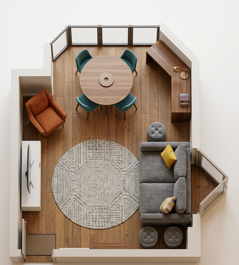 clean this up change this into a modern luxury living room with built in carpentry suspended tv console on the right wall sofa on the left wall keep the walls ceiling and windows same