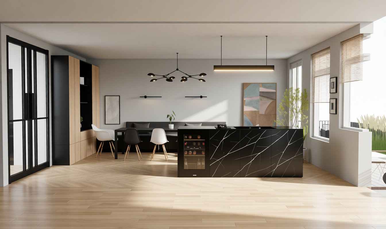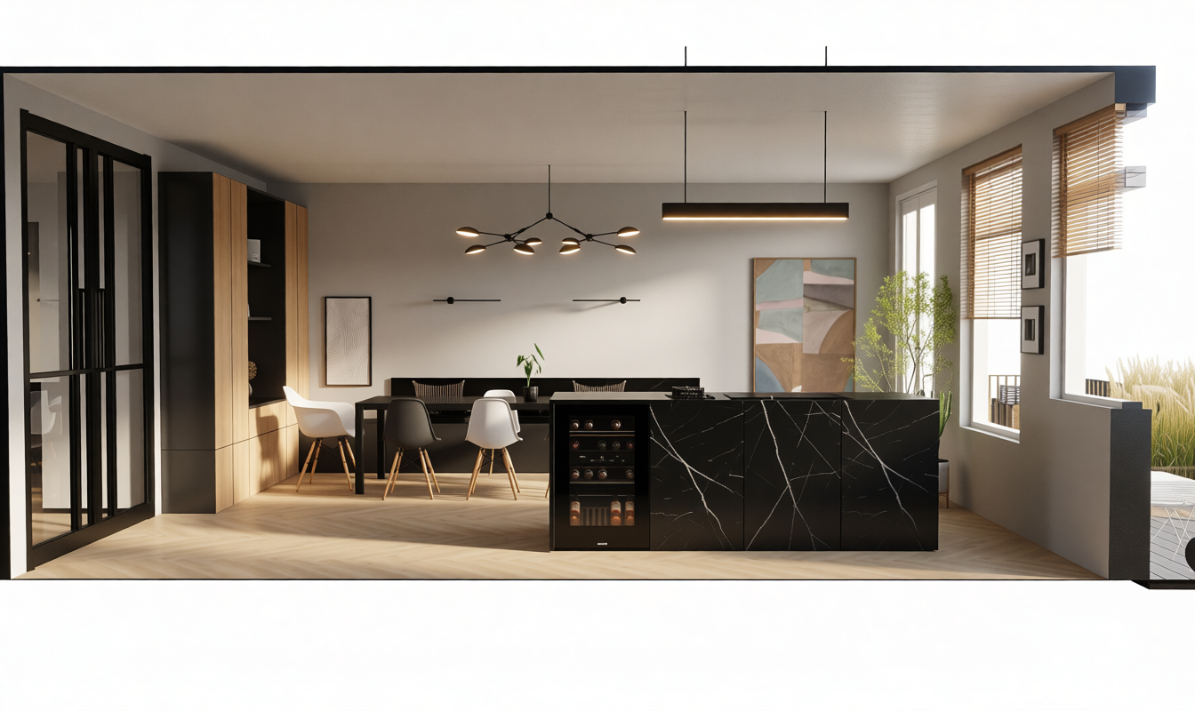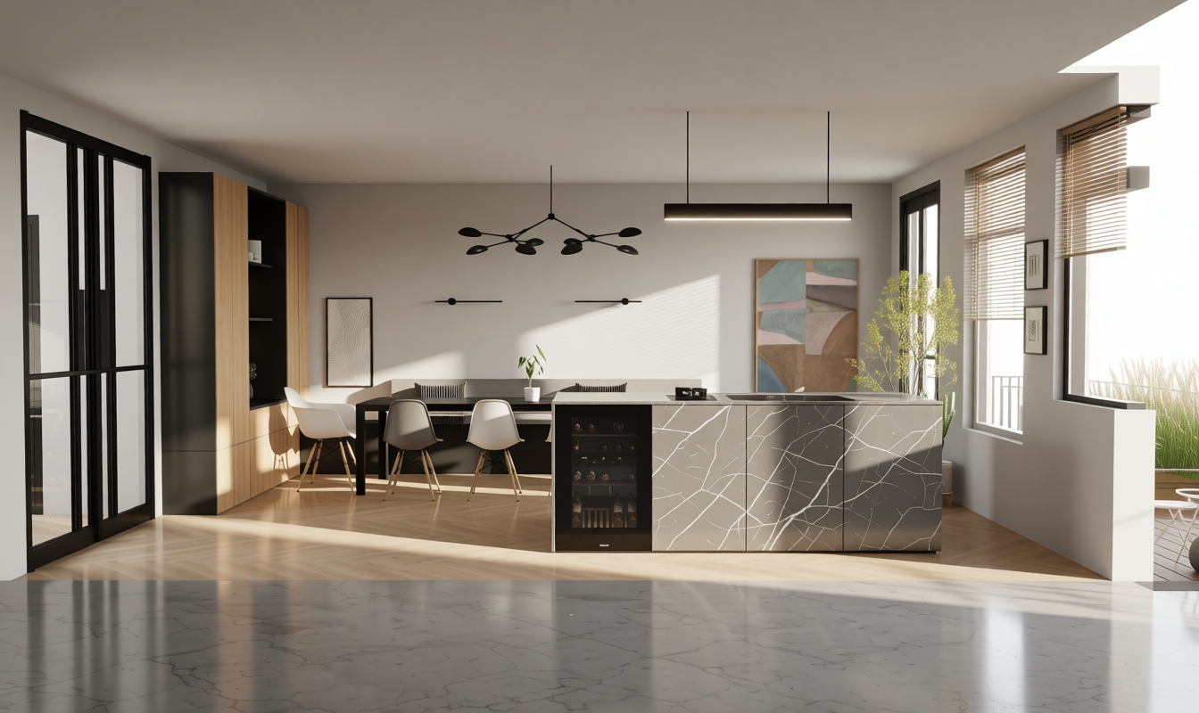 turn this into a sleek warm mid century kitchen use warm oak modern cabinetry with integrated appliances heavy stone countertops make this like a tom ford sleek kitchen architecture