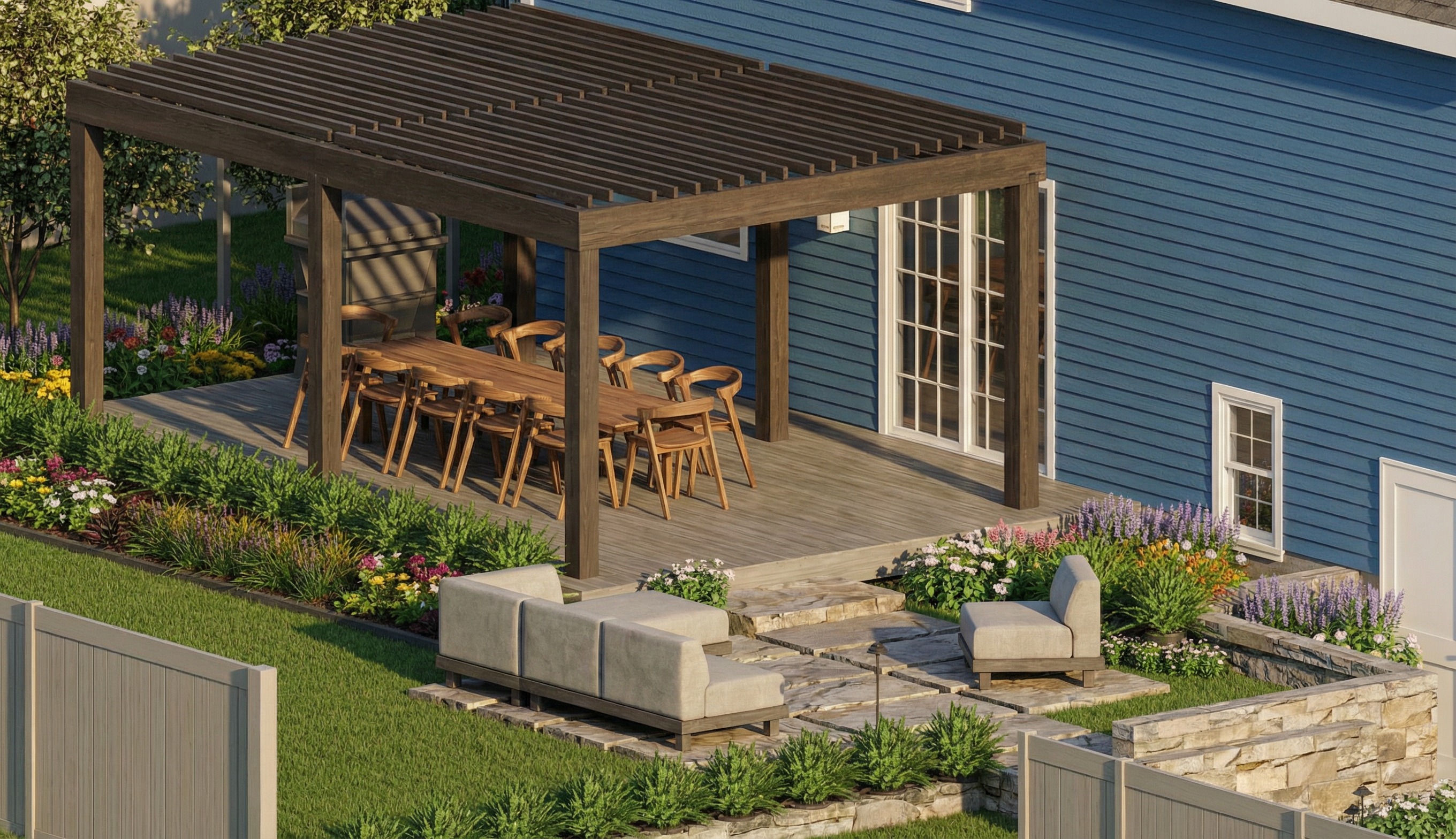 a manicured lawn low maintenance shrubs native plants concrete pavers pathway leading to the entrance blue house black metal pergola with red brick retaining wall