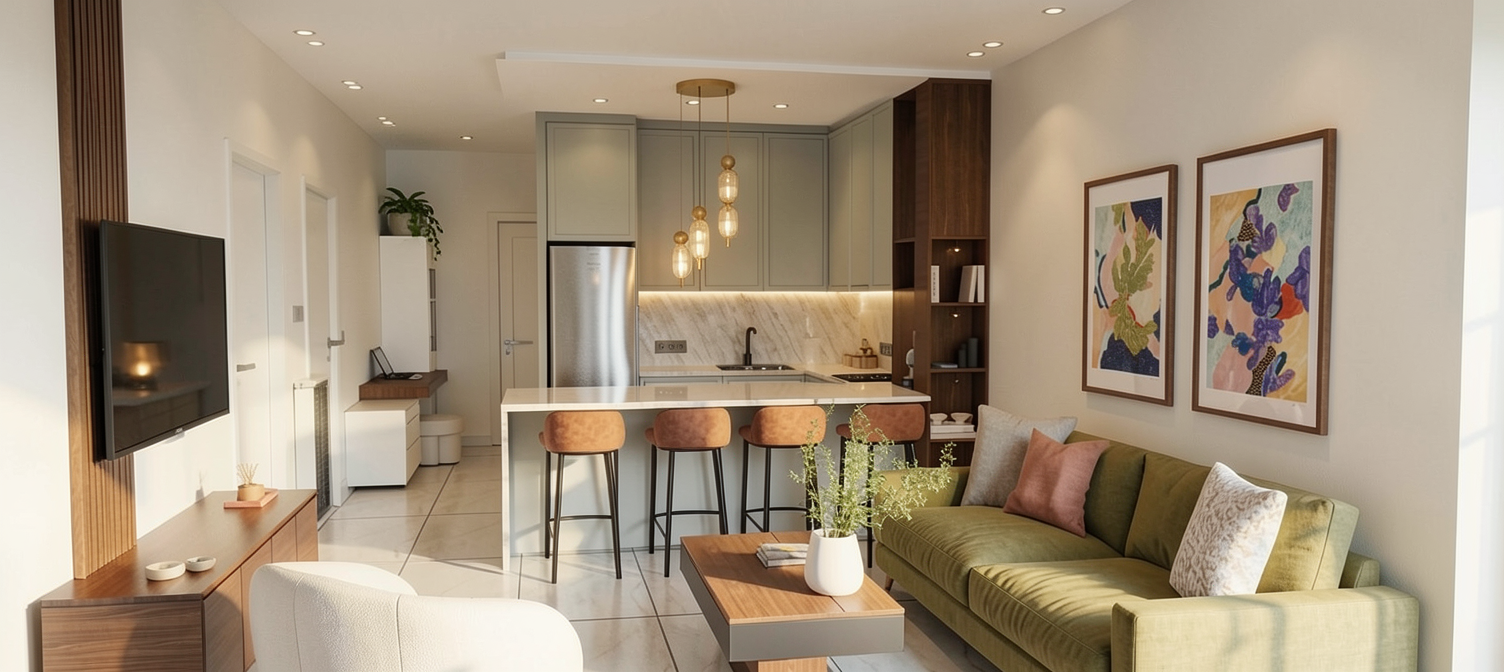 do not change the cabinets in any way preserve the exact cabinet colors materials finishes dimensions door and drawer styles hardware spacing alignment and all geometry exactly as shown do not alter the countertop shape backsplash appliances flooring lighting fixtures or wall structure only remove the construction materials clutter and mess from the scene clean the room and make it look finished and staged add a few simple tasteful home accessories appropriate for the style of the space but do not add or remove any furniture windows or architectural elements maintain the original lighting direction and realism enhance clarity and polish the photo while keeping the cabinetry and room design completely unchanged do not alter the lighting to keep the cabinet colors as they are in the image put these cabinets in between walls with flush fillers and floating shelves above and white countertop