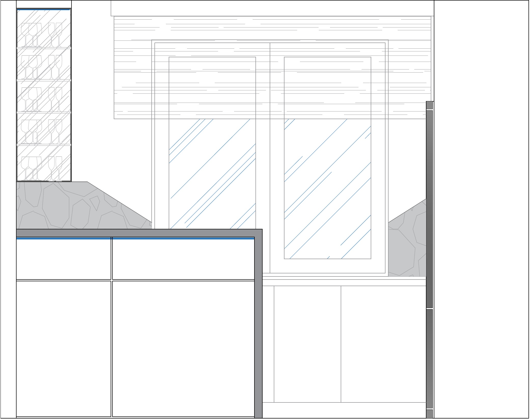 view towards the kitchen on the left side a white gypsum board wall edge 10 cm thick a bar counter runs along this wall 120 cm high and 156 cm long the bar counter has a botticino stone frame the top surface and the right vertical side panel both 5 cm thick forming a continuous l shaped stone edge concealed linear lighting is integrated underneath the stone countertop the front face of the bar counter is clad in oak wood divided into four vertical panels with 10 mm shadow gaps between them without cover trims to the right of the bar counter is the passage leading into the kitchen the clear passage width between the bar counter and the opposite wall is 109 cm a refrigerator is positioned behind the wall protruding 7 cm beyond the wall plane in the background a window and the kitchen work area are visible positioned 234 cm from the bar counter the kitchen worktop is made of botticino stone with wooden base cabinets below a sink is located directly in front of the window above the bar counter a suspended wooden cabinet with glass doors and internal glass shelves displaying glassware with integrated concealed lighting total kitchen height is 265 cm contemporary warm refined interior realistic proportions soft ambient and accent lighting