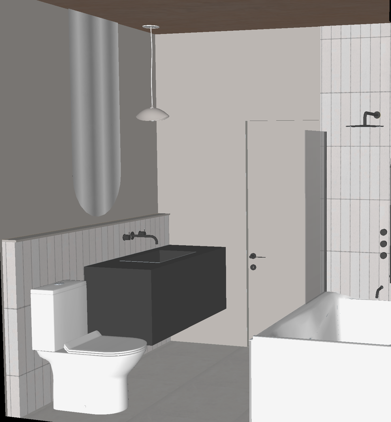 interior shot a modern minimalist bathroom featuring a floating black vanity with a sleek white sink and matte black faucet the toilet is classic white paired with soft gray floor tiles the walls are adorned with pale gray tiles accented by a white subway tile shower area with matte black fixtures a round mirror with a polished black hangs above the vanity a simple white pendant light provides warm illumination casting a cozy glow the wooden ceiling has a rich walnut finish enhancing the room s warmth the atmosphere is serene and elegant emphasizing clean lines and a neutral color palette add sun light architecture