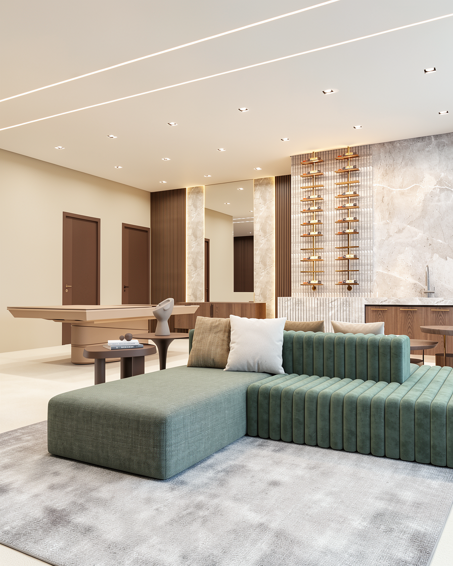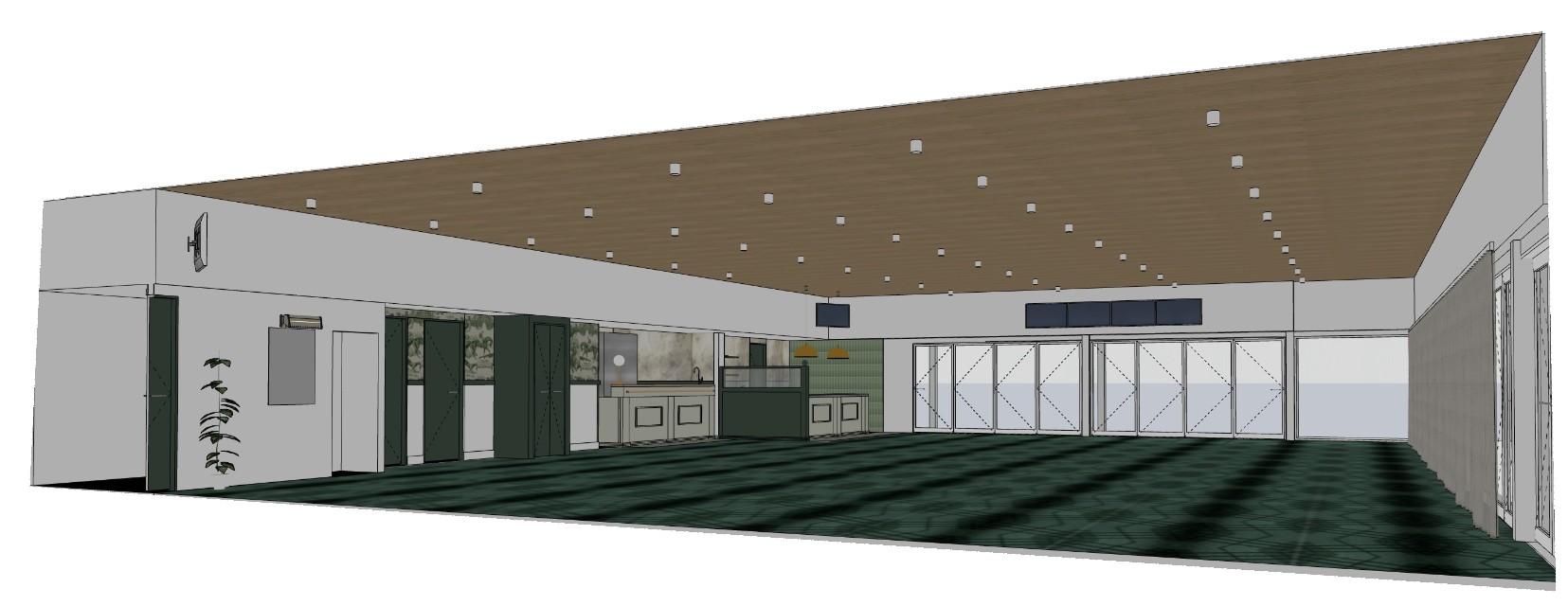 make interior render presentation worthy do not change the design add racecourse in the distance ceiling to be soft timber with no reflectivity lessen glare to ceiling lights change time of day for sunlight to be higher in the sky green carpet texture internally