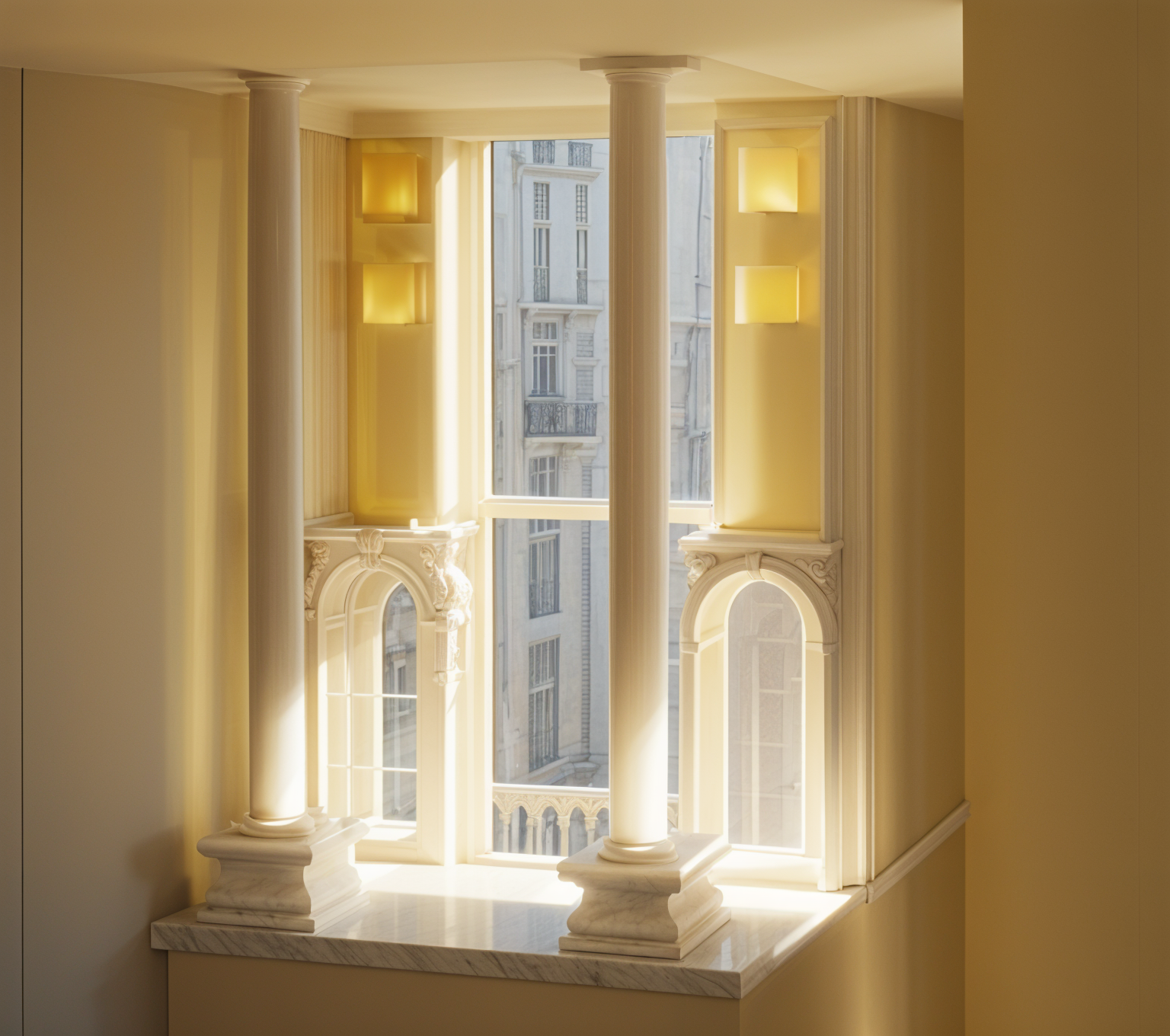 create a baroque inspired scene with classical elements include a large window with ornate arches and columns and a sunlit interior the window should be adorned with intricate stained glass designs featuring rich colors and patterns the overall atmosphere should be grand and opulent evoking a sense of history and elegance with the out architecture