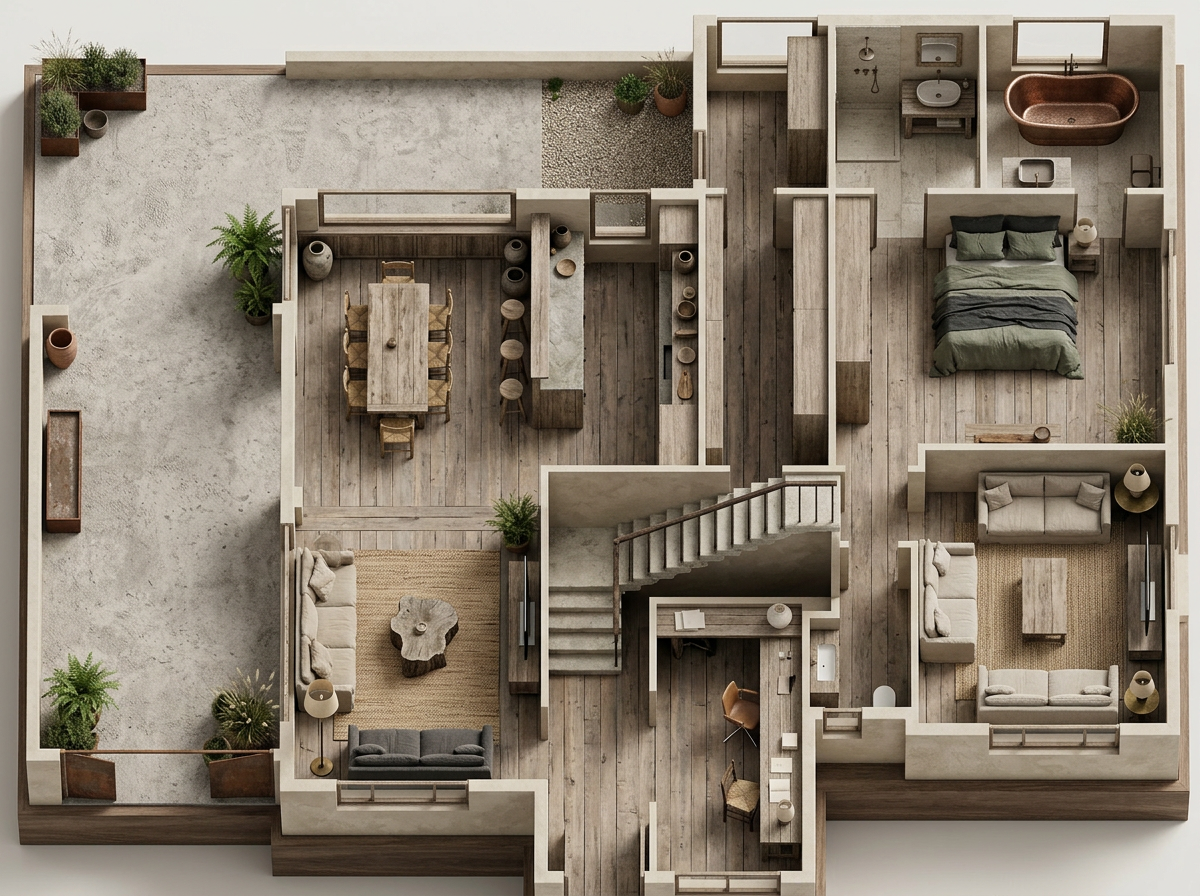 convert this floor plan into a realistic isometric 3d view of a full house show the space from an elevated angle with furniture walls and details visible add some warm textures and soft shadows use the same furniture as shows on the plan do not change the orientation of the floorplan