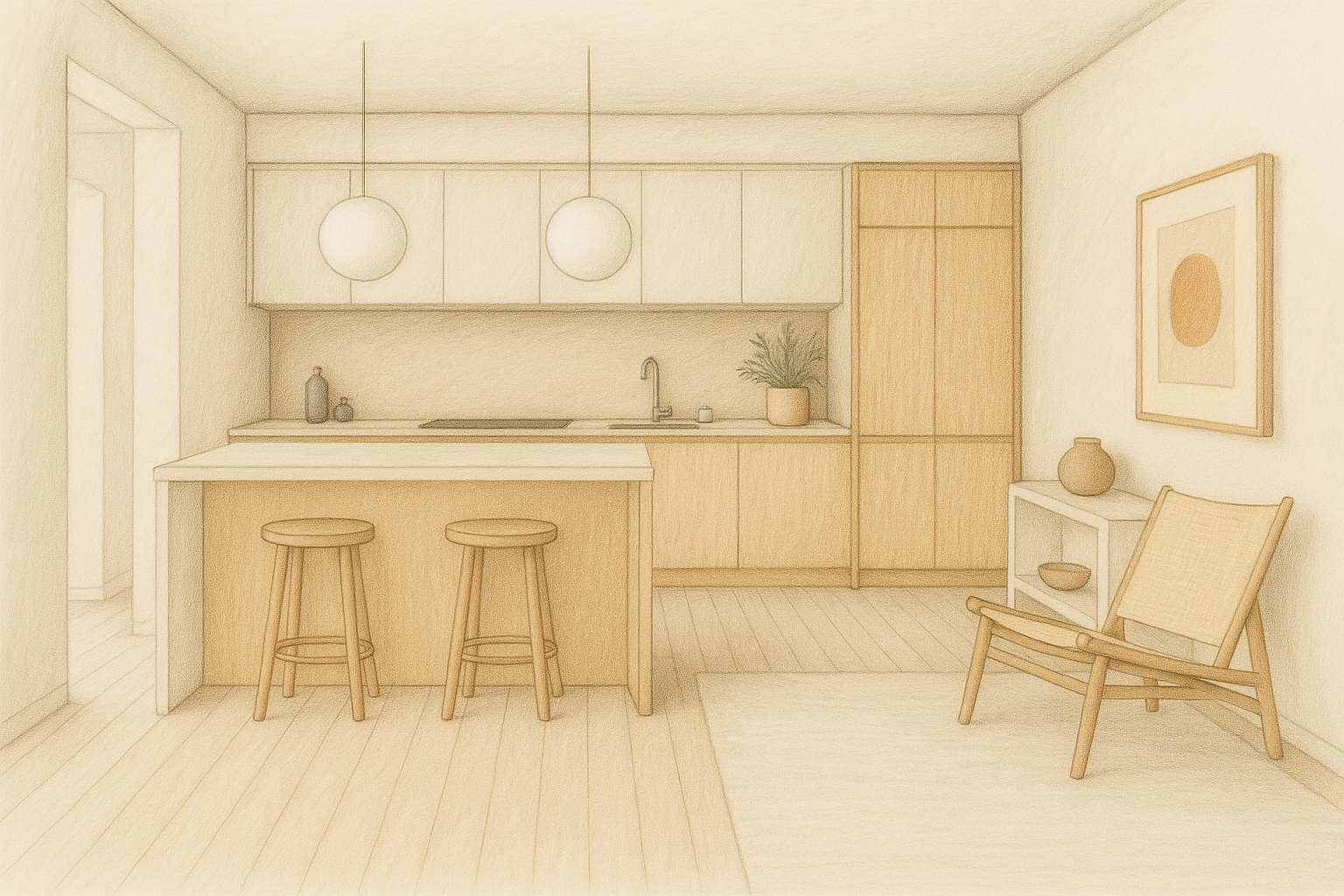 interior shot render this interior realistically as a japandi inspired space that feels affordable yet elevated emphasize simplicity warmth and natural materials light wood soft linen neutral tones and handmade textures the design should balance minimalism and comfort clean lines clutter free surfaces and thoughtful functional furniture lighting should be natural and calm like a soft morning glow or diffused afternoon light the atmosphere should feel grounded and serene not glossy or luxurious but beautifully honest and refined capture the quiet harmony between scandinavian functionality and japanese restraint photorealistic quality subtle shadows true to life textures cinematic perspective