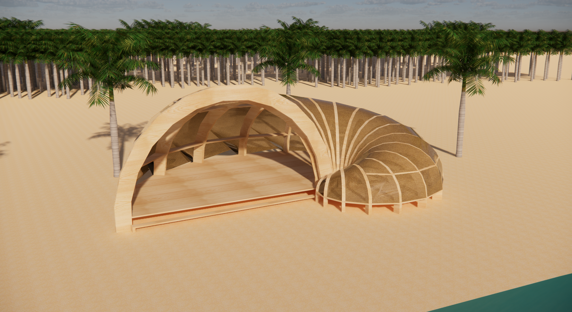 create an ultra realistic rendering of this 3d wooden structure located on a tropical beach emphasize a warm sunny golden hour atmosphere that highlights the wood texture grain shadows and natural imperfections show the detailed sand texture with footprints soft irregularities and warm lighting inside the structure clearly reveal a small beach bar with many tables stools and people using the space show the interior as lively comfortable and shaded the entire structure is wrapped in a light semi transparent fabric veil softly filtering sunlight the veil should show translucency soft highlights and subtle shadows cast on the wooden frame add a dynamic beach scene around the structure many people families groups of friends swimmers in the background interacting naturally with the space include dense tropical vegetation especially palm trees leafy bushes and scattered plants that integrate the project into a lush environment ensure a realistic color palette crisp materials and an immersive vibrant summer atmosphere the camera angle must respect the perspective of the uploaded 3d model