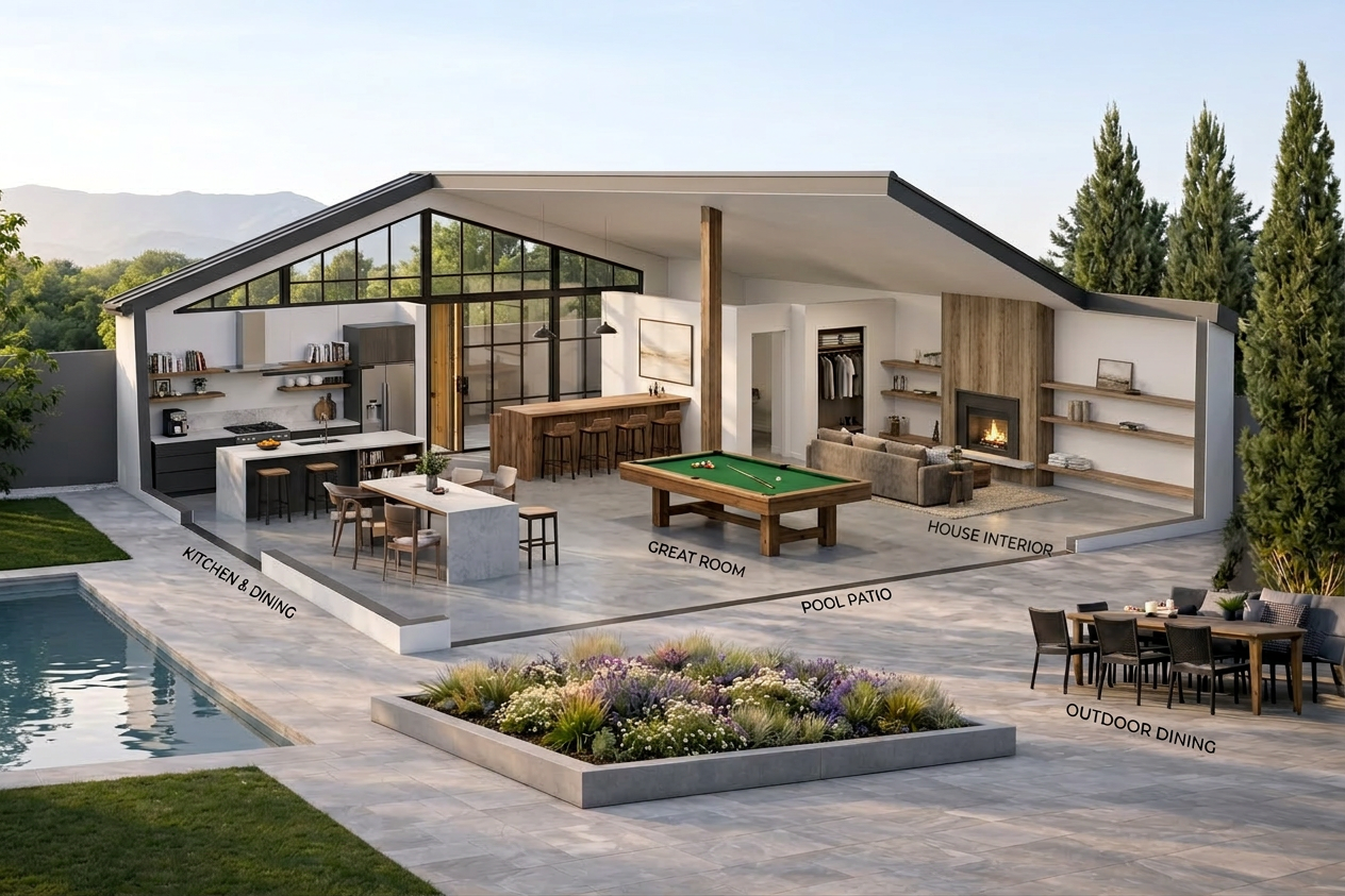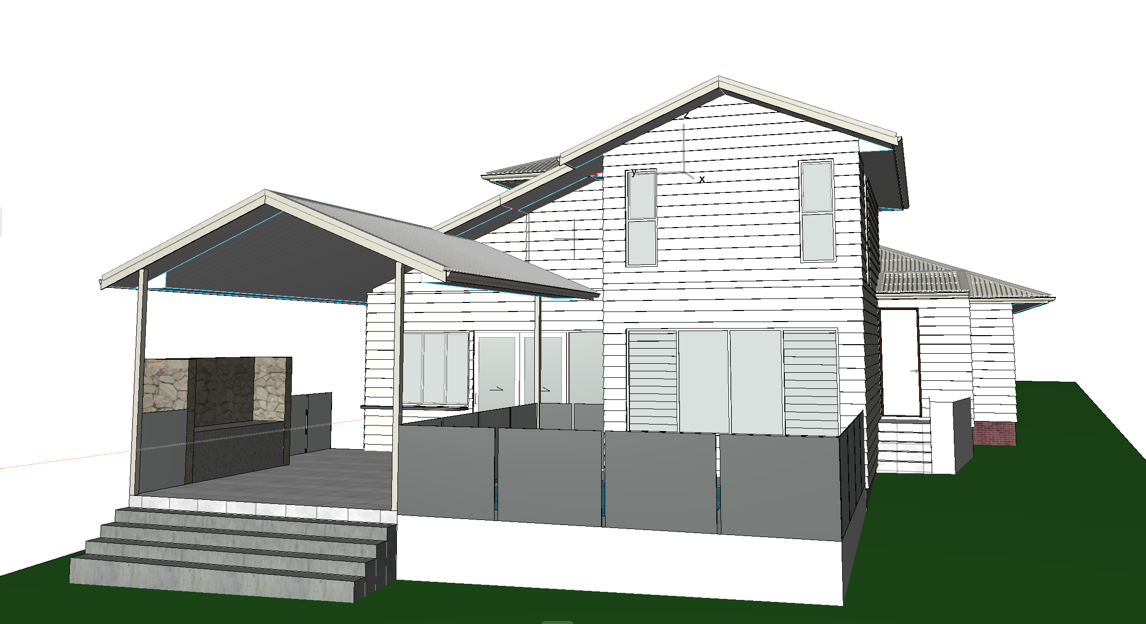 transform this archicad screenshot showing a back entertaining deck and pool area show a driveway on the right hand side of the image