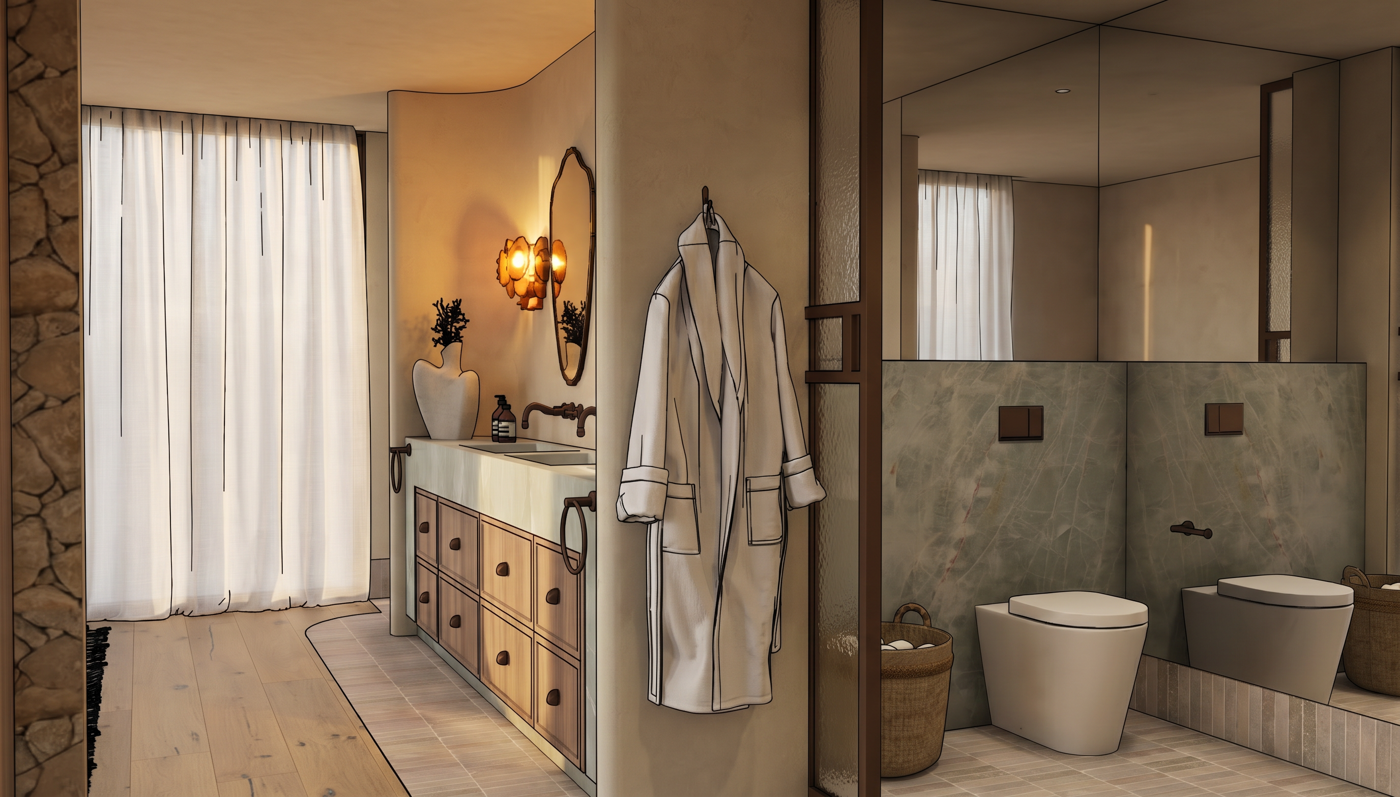 walls and ceiling are warm off white limewash bed head wall is a freeform stone cladding golden hour moody turn bedside lamps on bedside lamps are rice paper