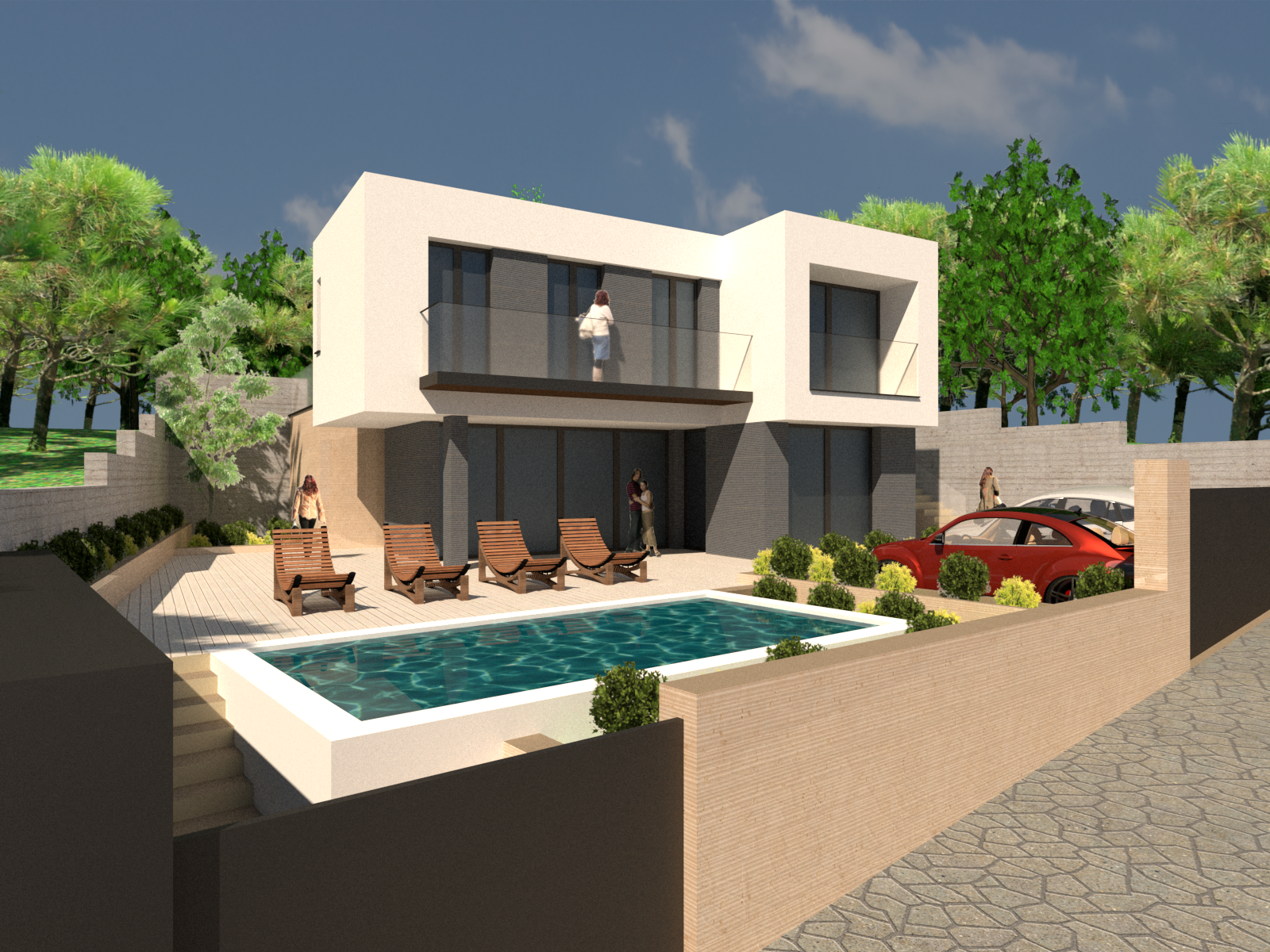 exterior shot single family house with contemporary architecture minimalist style and clean lines with a clear vocation of openness to the outside it has large glazed surfaces that allow a fluid connection between the interior spaces and the natural environment enhancing the luminosity and views the main materials combine the white of the cladding with wood and metal details providing warmth and sophistication the outdoor space is designed as an extension of the home with a swimming pool integrated into a wooden platform and lounge areas that invite you to rest and contemplate the landscape the surroundings transmit an image of elegance balance and serenity architecture