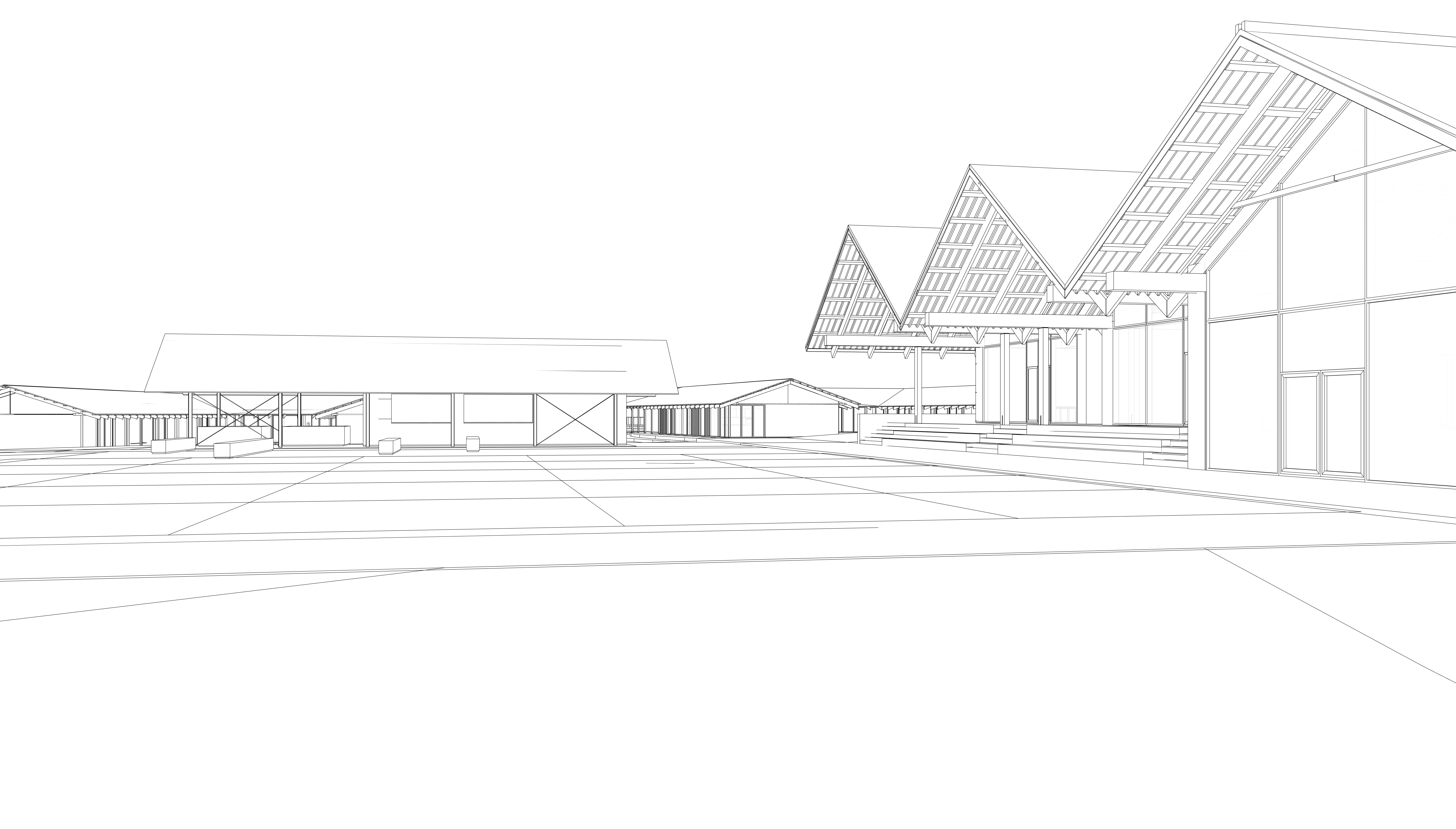 scandinavian timber pavilion with large pitched roofs and glass facades warm natural wood structure realistic material variation subtle weathering in wood late afternoon sunlight with long soft shadows cinematic architectural photography detailed gravel foreground with natural variation people casually walking and entering the building warm interior lighting visible through glass soft clouds in blue sky realistic reflections in glass ultra realistic architectural render photographed with 35mm lens