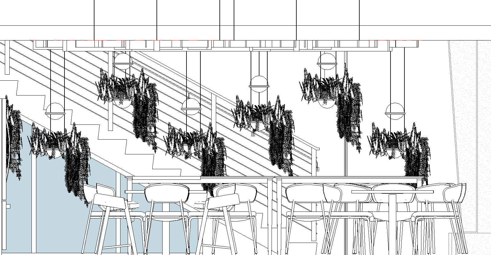 make this look realistic the pendants are warmly lit bulbs with black hardware the table to be a light wood and the barstools are navy