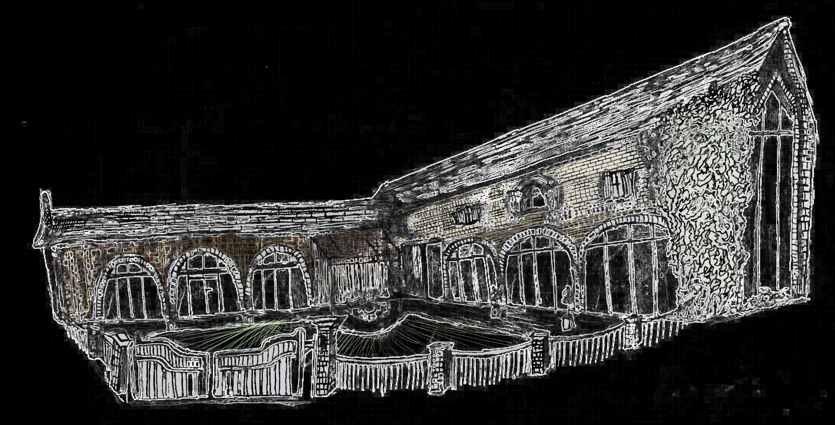 contemporary exterior shot a brick barn conversion with three arch windows on each side the middle one as a glass door to the right of the building that is facing away from the camera is a large two story high window the top is triangular in shape that covers most of the wall to the right beside it there is evident ivy overgrowth the left side of the building is a slightly darker brickwork with a hint of red and is only one story high where as the main building is a very light beige brickwork between the arch of the left one story extension and the two story building are wooden pannels that connect the two structures architecture