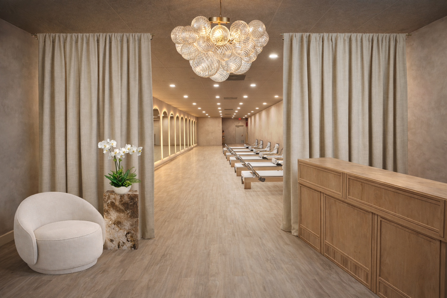 create a serene and elegant interior of a pilates studio use soft beige tones for the walls and ceiling to create a calming atmosphere incorporate a cluster of intricate transparent glass globes hanging as a chandelier radiating a warm gentle light arrange neutral plush curtains framing the entrance in a subtle textured fabric position a comfortable rounded beige chair on the left next to a natural marble pedestal with a potted orchid featuring lush green leaves and delicate white flowers continue the warm wooden tones for the floor counter and pilates equipment emphasizing a harmonious and inviting ambiance