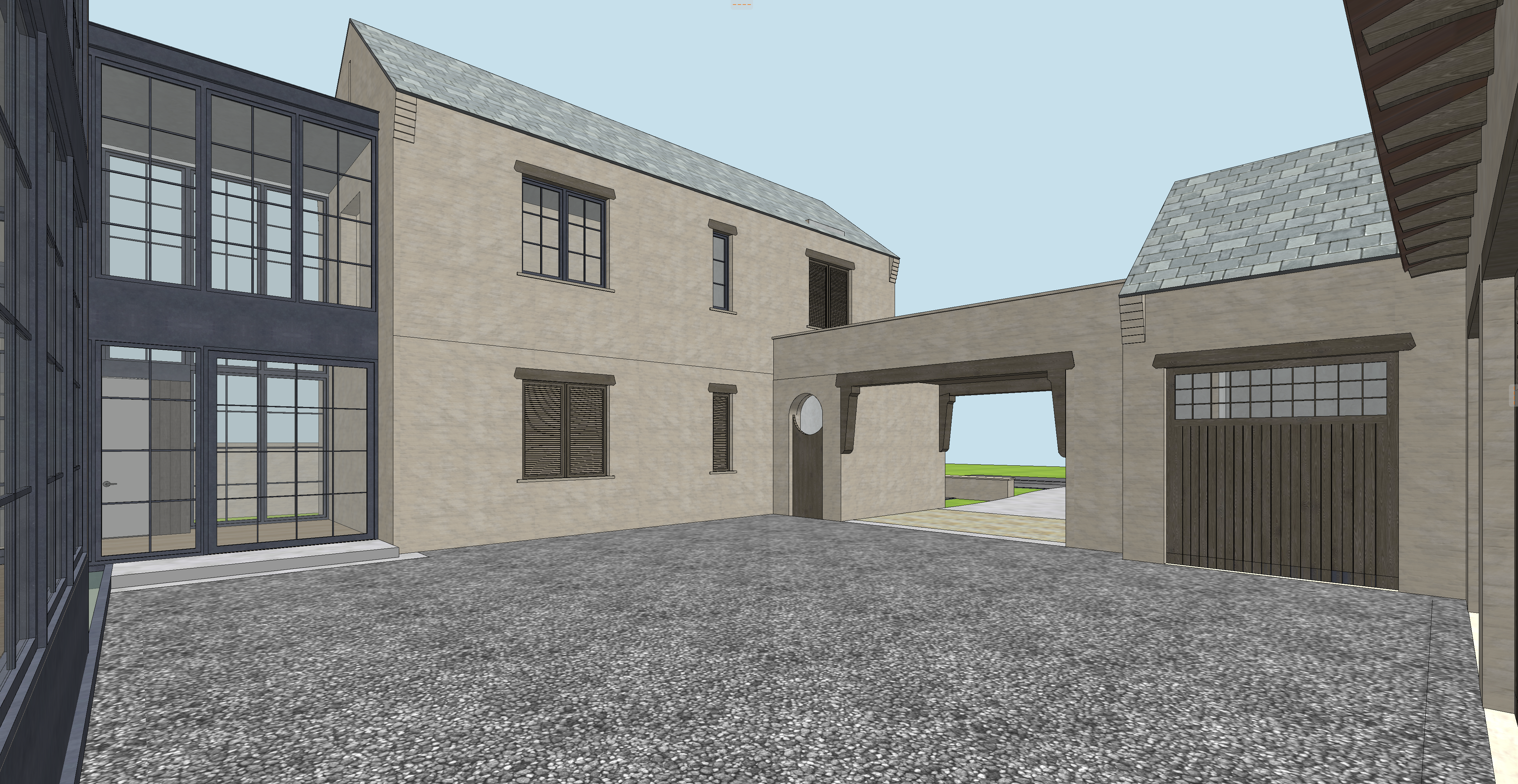 please render this to look hyper realistic the primary material is to be a tan limewashed brick the windows are to be a blackened steel roof to be slate tiles add trees in the background
