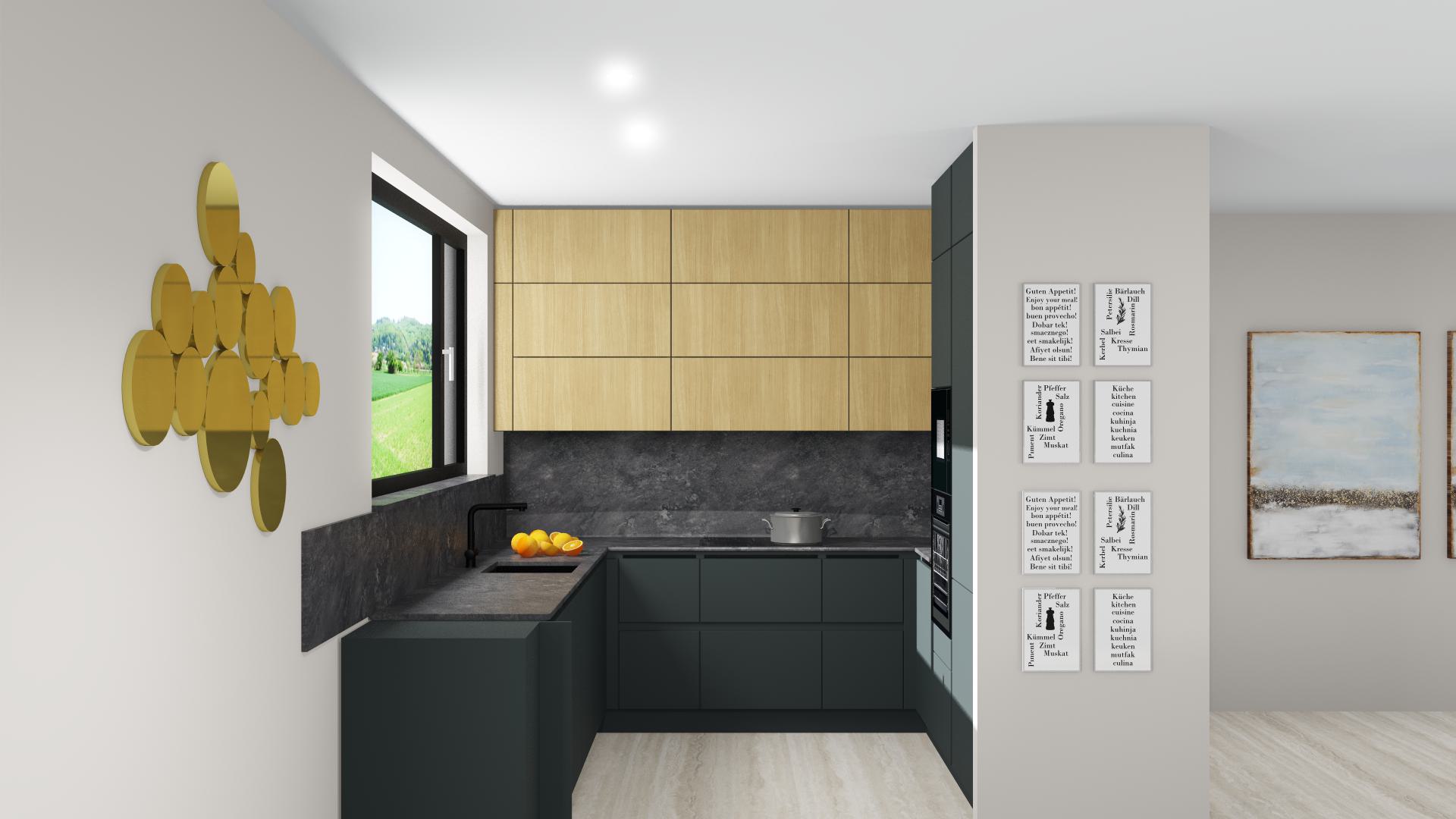 keep the colors keep the layout of the cabinets add a landscape outside the windows