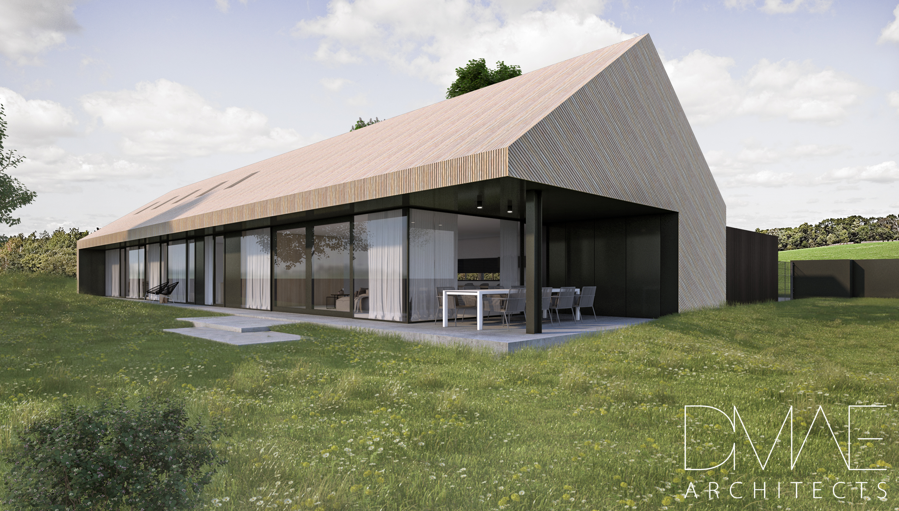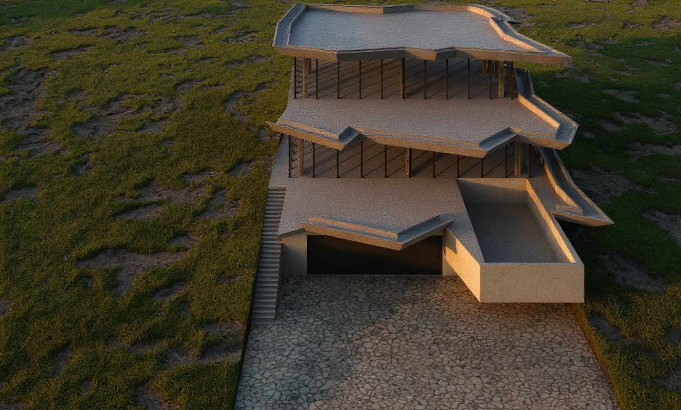 preserve the materials and shape of the building make all the greenery more realistic building on a meadow and a pine forest in the distance more realistic trees in the front part of the garden large stones and a large clump of grass softer and more realistic light