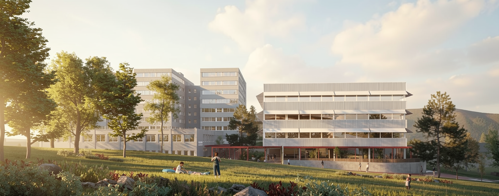 add soft light inside the right building big tree on the right side of the picture higher grass with white flowers in the front